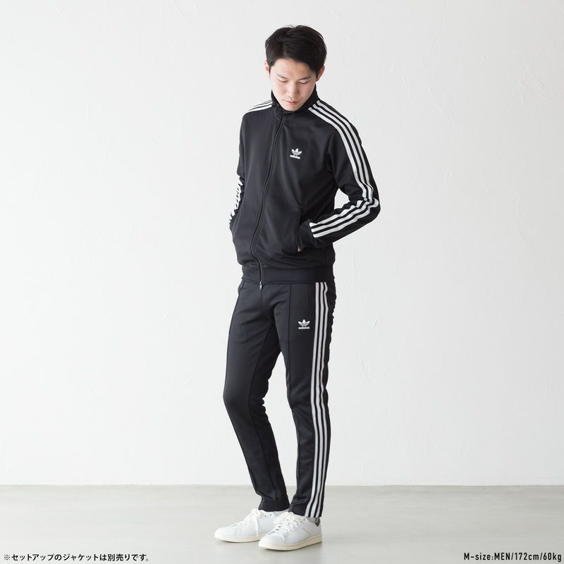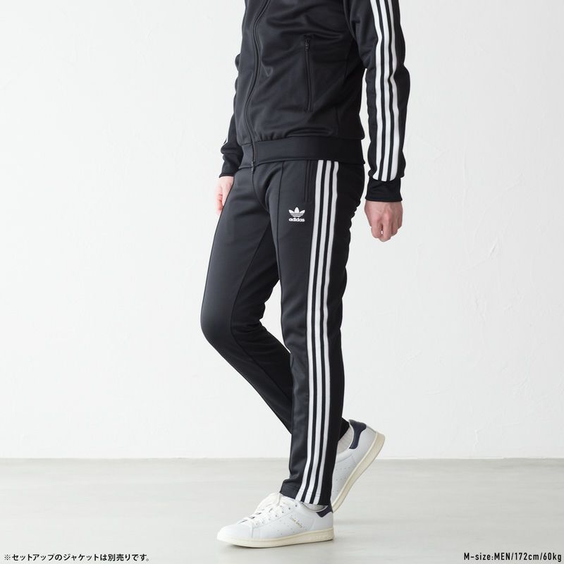 ドイツの伝説的サッカープレイヤー、ベッケンバウアーの名を冠したトラックパンツ。 アディダスの象徴スリーストライプをサイドに配し、センターステッチを利かせたクラシカルなデザインに仕上げています。ボディにはコットン52%を使用したレトロな風合いのダブルニット生地を採用。シルエットは裾に向かってシェイプしたスリムテーパード。adidasジャージの中でも美脚効果が高くスマートに穿きこなすことができます。