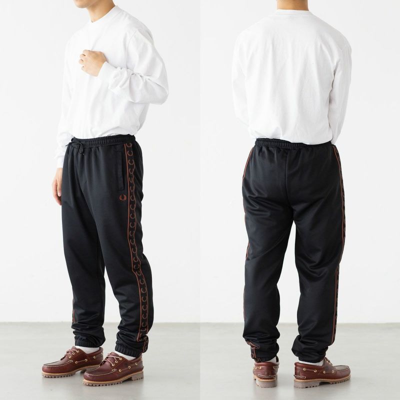 フレッドペリーお馴染みのローレルのコントラストテープが施されたトラックパンツ。