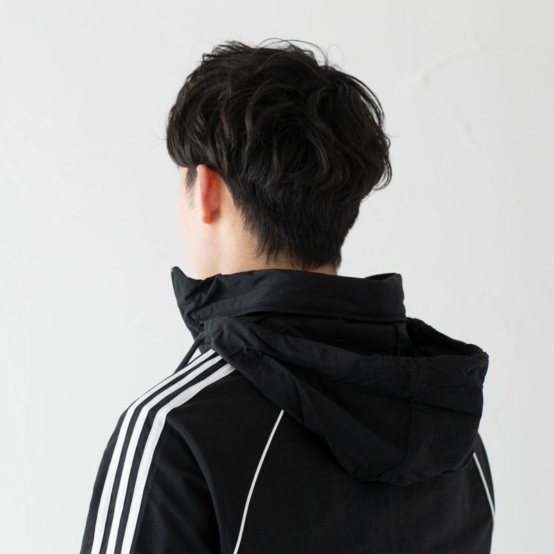 adidas Originals 巻き込みフードのウインドジャケット。