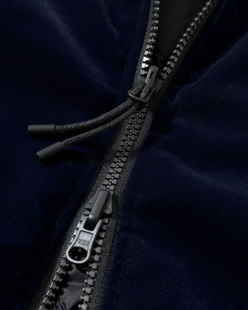 表側は秋冬にマッチするベロア生地にスーベニア刺繍を配し、裏側はツートーンカラーが映えるダイヤキルトのダウンを採用。気分やコーディネートにあわせて使い分けることができます。