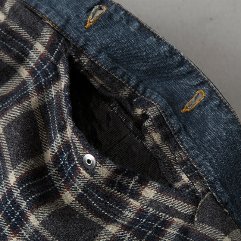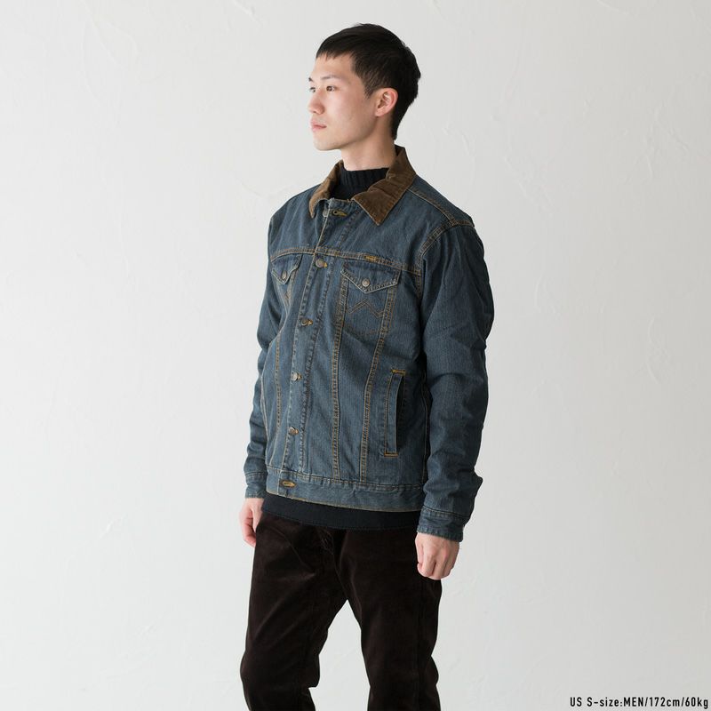 自然に着古したようなユーズド加工ブロークンデニムで仕立てた、ブランケット裏地付きの防寒仕様トラッカージャケット。こちらは現在アメリカ本国で流通している輸入製品です。ブラウンのコーデュロイ襟は立てることで首元の風を防ぐとともに、ワークテイストを引き立たせるアクセントに。ニットやパーカーを着込むことで寒い季節も安心の暖かさを提供してくれる一着、リアルなワークウエアの雰囲気を纏った、堅実剛健なアイテムです。