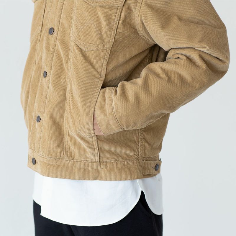 ラングラー伝統のトラッカージャケットをベースに身頃のボア裏地と袖のキルト裏地で防寒性能をアップ。フロントの切り替え部分にハンドウォームポケットも追加されています。