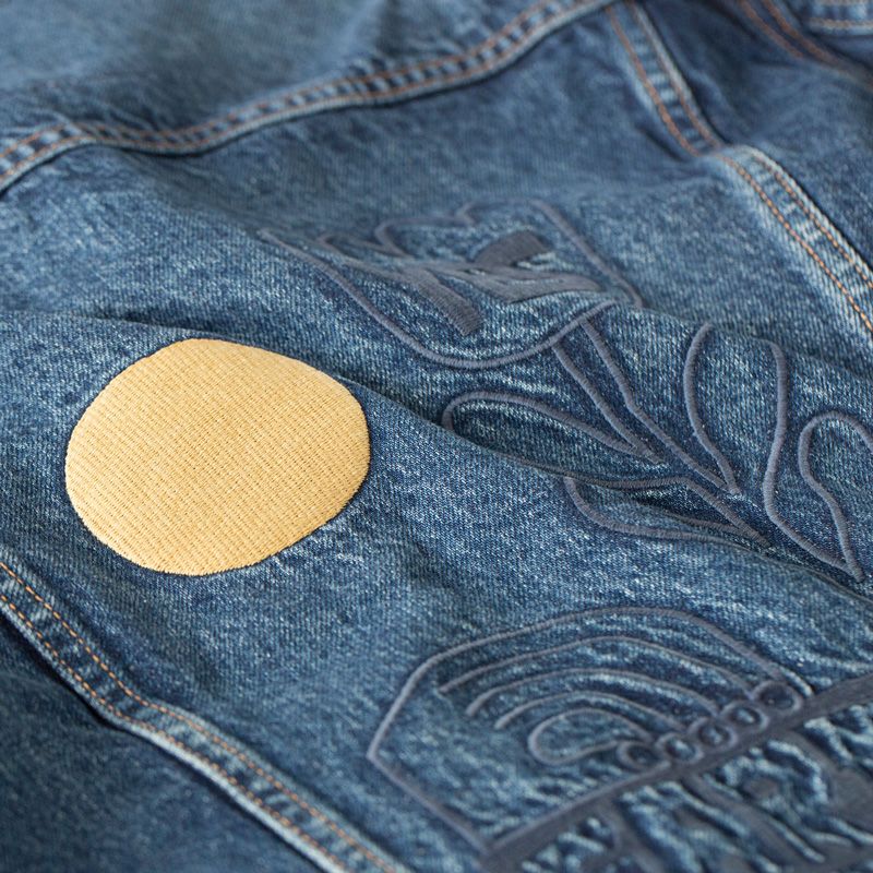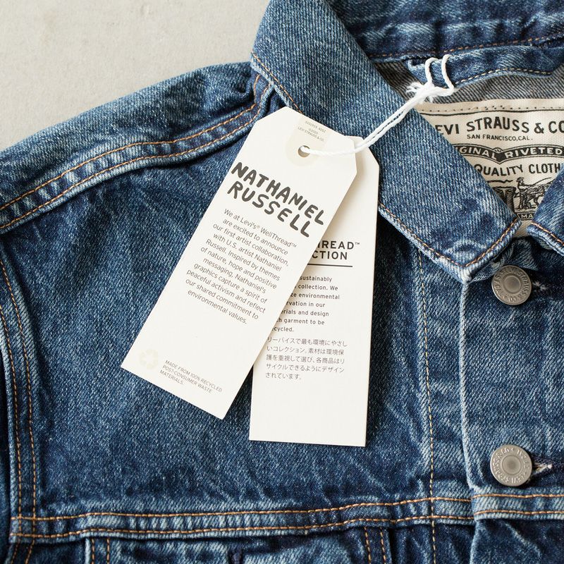Levi’s WELLTHREADは開発プロセスの各段階に持続可能性を取り入れ、着る人に対しても地球に対しても大きな責任を果たすコレクション。すべての製品は100%再生できるようにデザインされ、製造担当スタッフの健康に投資した施設で作られています。バックスタイルを彩るのはサンフランシスコを中心に活躍する注目のアーティスト、ナサニエル・ラッセルのアートワーク。細やかな刺繍で表したピースフルなグラフィックがサスティナブルデザインをより印象付けています。