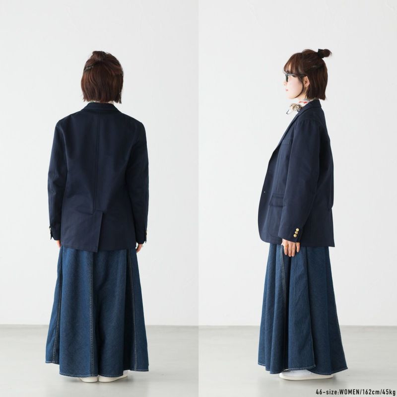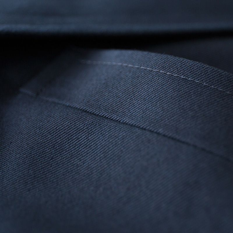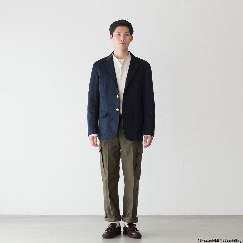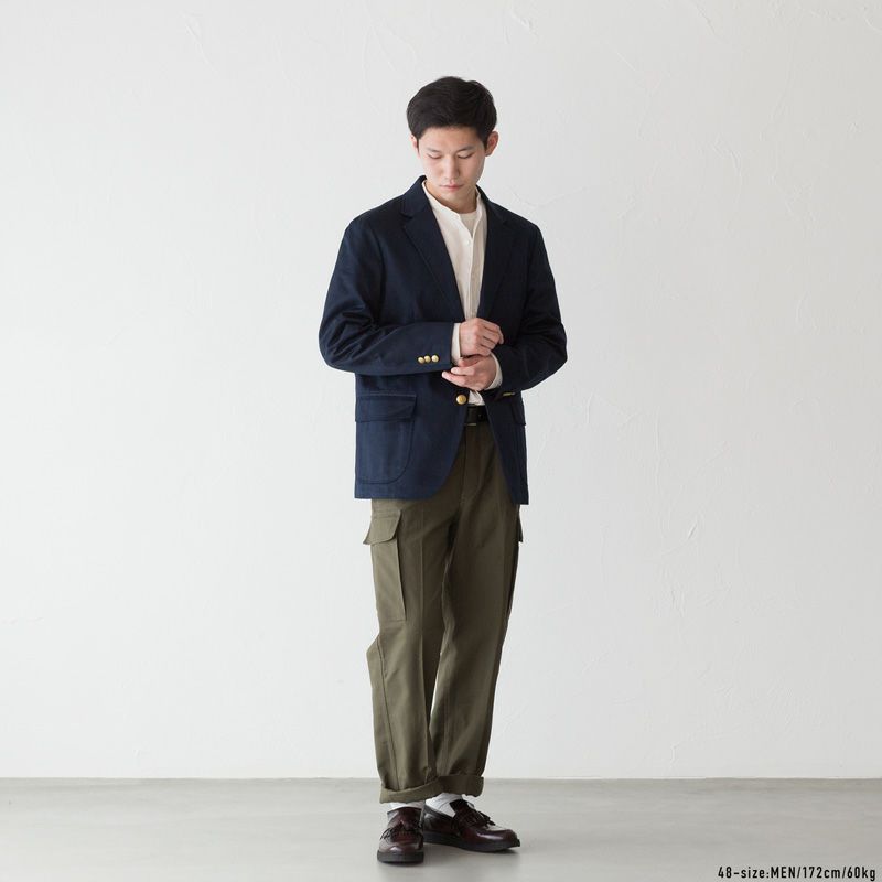 いつまでも綺麗に着たいウール素材の紺ブレと違い、デニムのように自然なアタリや色落ちが楽しめ、ヴィンテージライクな経年変化が期待できます。染色では濃色で起こりがちな赤い退色を防ぐ染料を使用し、白く色落ちていくよう調整されています。