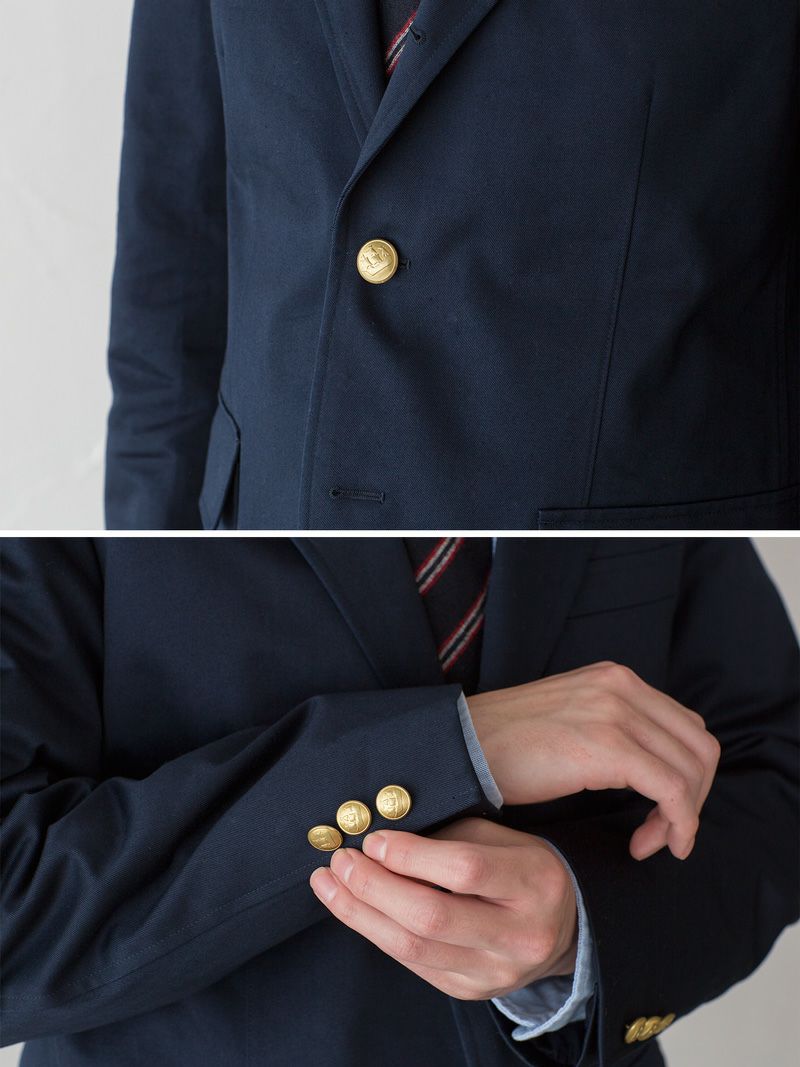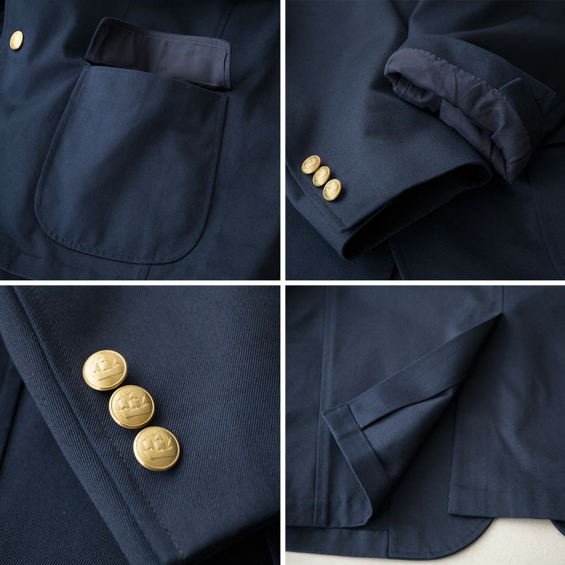 正統派の紺ブレになくてはならない金ボタンは、ビンテージのような風合いを表現できる、帆船トレードマーク入りのオリジナル。三つボタン段返り、6mmステッチ、パッチ&フラップなど、ディテールはアメリカン・トラッドの伝統的な仕様をしっかり踏襲しています。