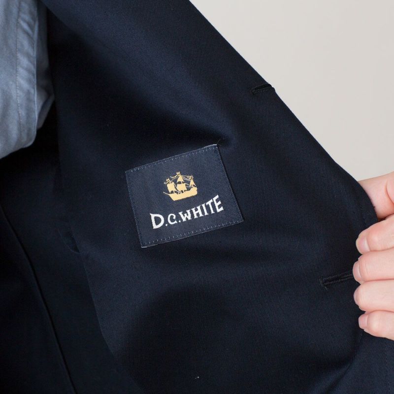 背中の肩周りだけに裏地をつけた背抜き仕様は、適度な通気があるのでロングシーズン着用しやすいのが特徴。D.C.WHITEのシグネチャーである帆船が型押しされたオリジナルの金ボタンにも注目です。
