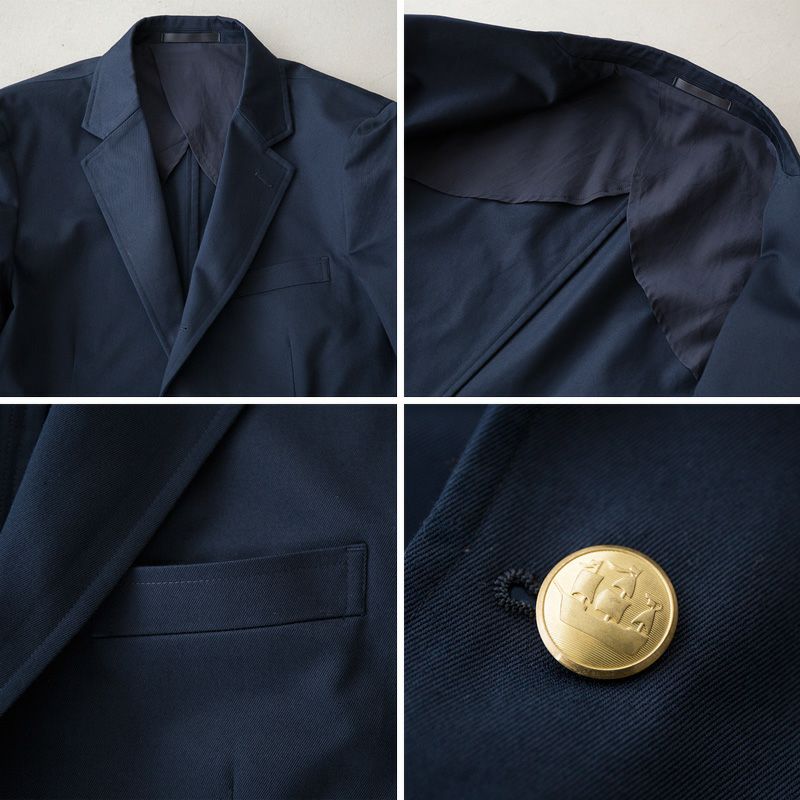 こちらは米陸軍士官学校「ウェストポイント」の制服をベースに、日本人がバランス良く着こなせるようモダナイズしたネイビーブレザー。いつまでもカッコ良く着れるよう、奇をてらわない正統派アイビースタイルを念頭に、素材にも拘り、自然な経年変化を楽しめるウェポンクロスと呼ばれるコットン素材の丈夫な織物を採用しています。