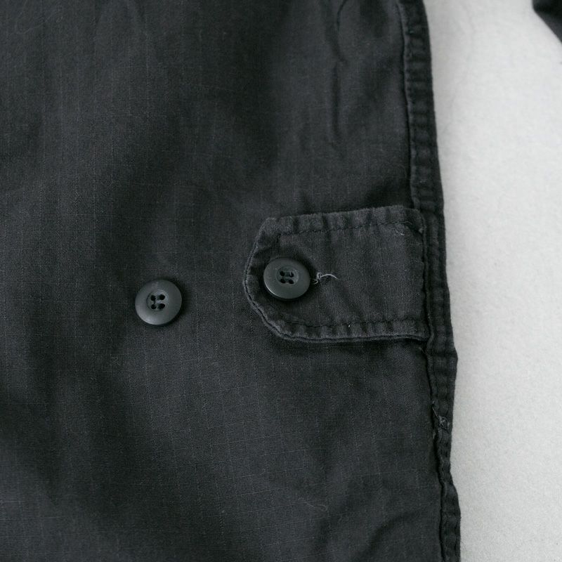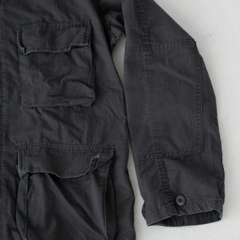 こちらは本格ミリタリー仕様のリップストップ素材にハードウォッシュを施したノーカーラー仕立てのジャケット。軽くソフトな風合いに仕上げたユーズドライクなアイテムです。豊富なサイズバリエーションで女性にもおすすめ。ノーカラーなので程よい抜け感があり、タウンウースでも個性が光るアイテムです。
