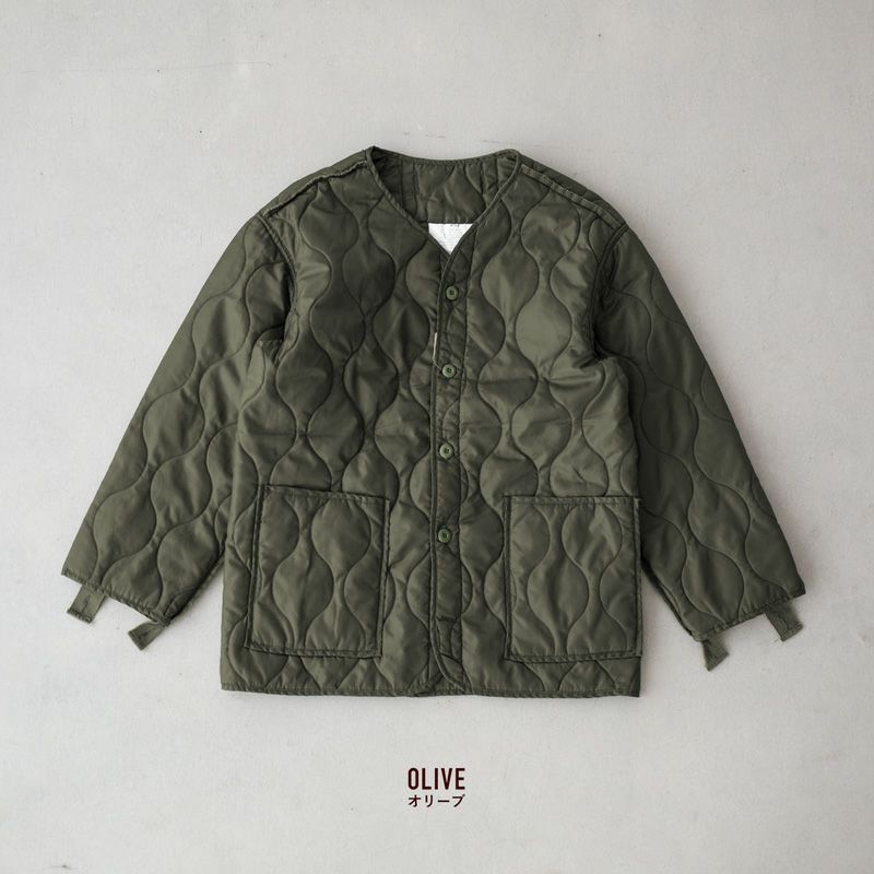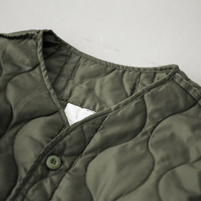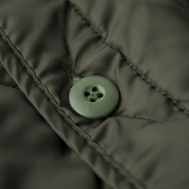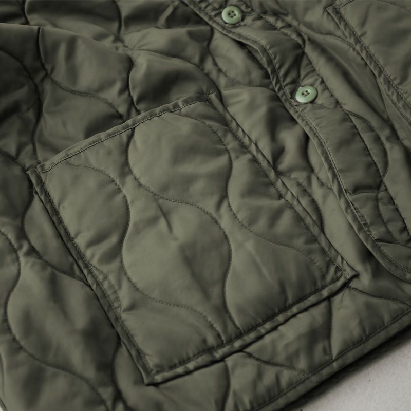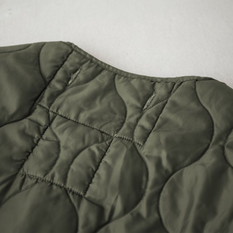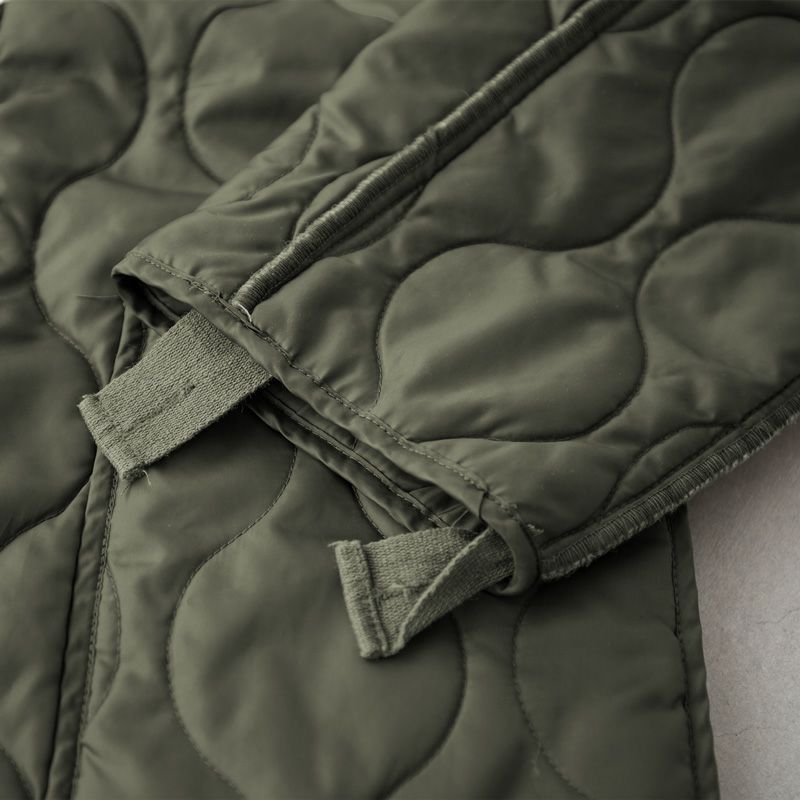 こちらはM-65フィールドジャケットのキルトライナー。世界で広く流通しているロスコの定番モデルではなく、日本企画ならではの秀逸なアレンジが加わったモデルになります。通常は横方向に流れるひょうたん型のキルトを縦方向に変えることで、着膨れを抑え、スマートな印象で着れるよう改良。さらにフロントボタンとハンドウォームポケットを取り付けたことで、ジャケットとしての使い勝手が向上しています。
