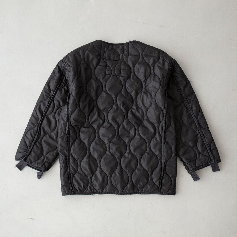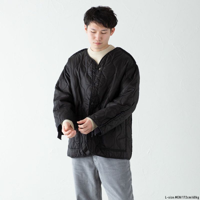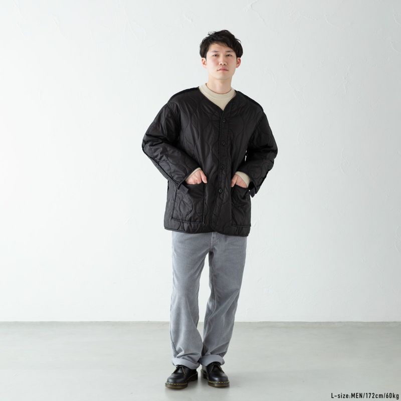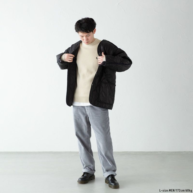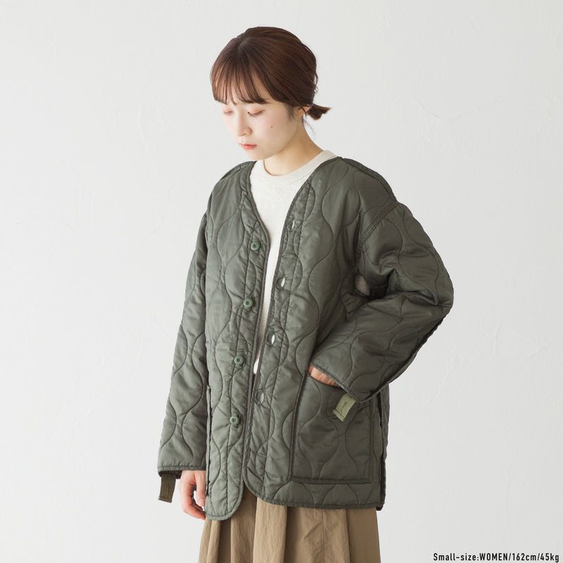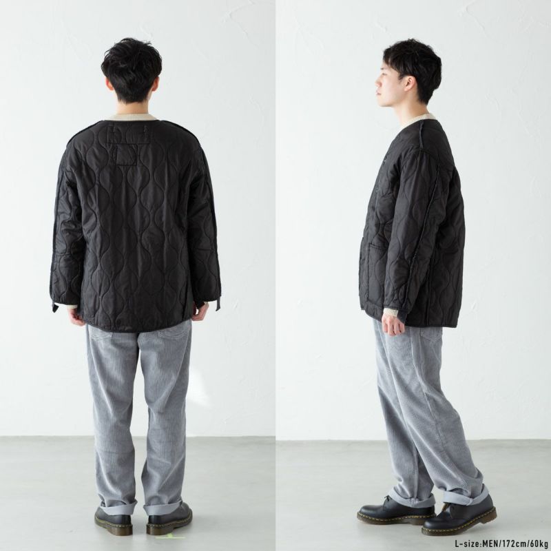 こちらはM-65フィールドジャケットのキルトライナー。世界で広く流通しているロスコの定番モデルではなく、日本企画ならではの秀逸なアレンジが加わったモデルになります。通常は横方向に流れるひょうたん型のキルトを縦方向に変えることで、着膨れを抑え、スマートな印象で着れるよう改良。さらにフロントボタンとハンドウォームポケットを取り付けたことで、ジャケットとしての使い勝手が向上しています。