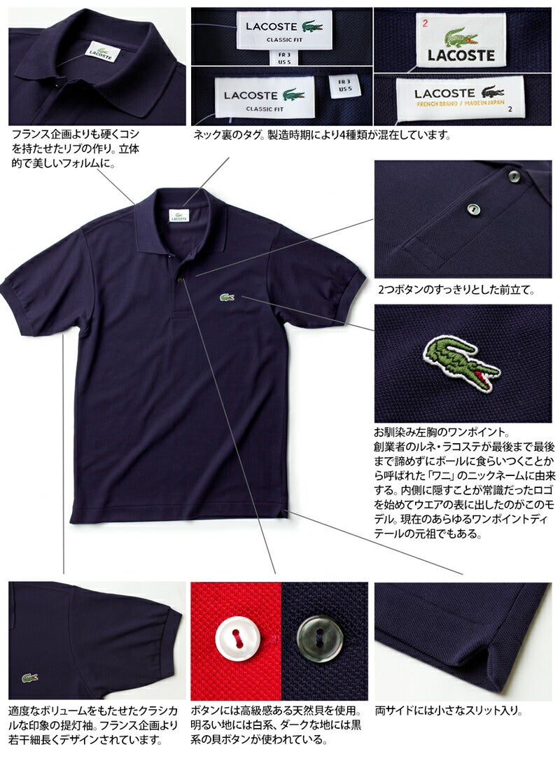 こちらは日本製のきっちりとした縫製のL1212Aモデルです。現在世界中で幾つかの製造ラインがあるL1212モデルですが、かつてフランス国内で製造されていた通称「フララコ」に最も近い生地の風合いといわれ、往年のラコステファンにも高く評価されています。