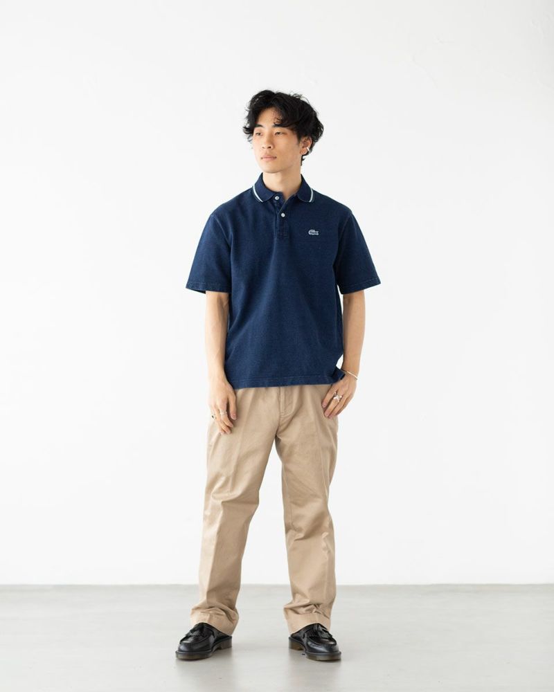 インディゴ染めでデニムライクに仕上げたポロシャツ。襟リブには白いストライプを走らせ、スポーティーなデザインを取り入れています。