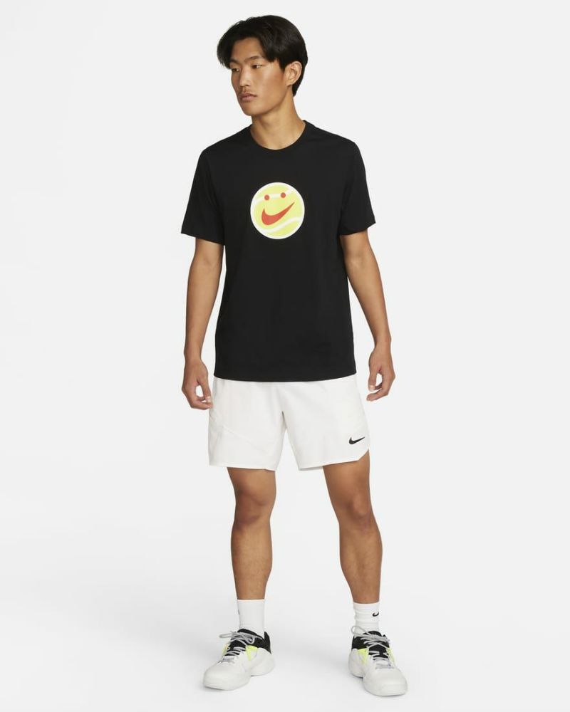 「Have a nike day」のテニスコートTシャツは、ボールに顔を描いたユーモアたっぷりの一枚。背面にもタイポグラフィーがプリントされた存在感のある仕上がりです。