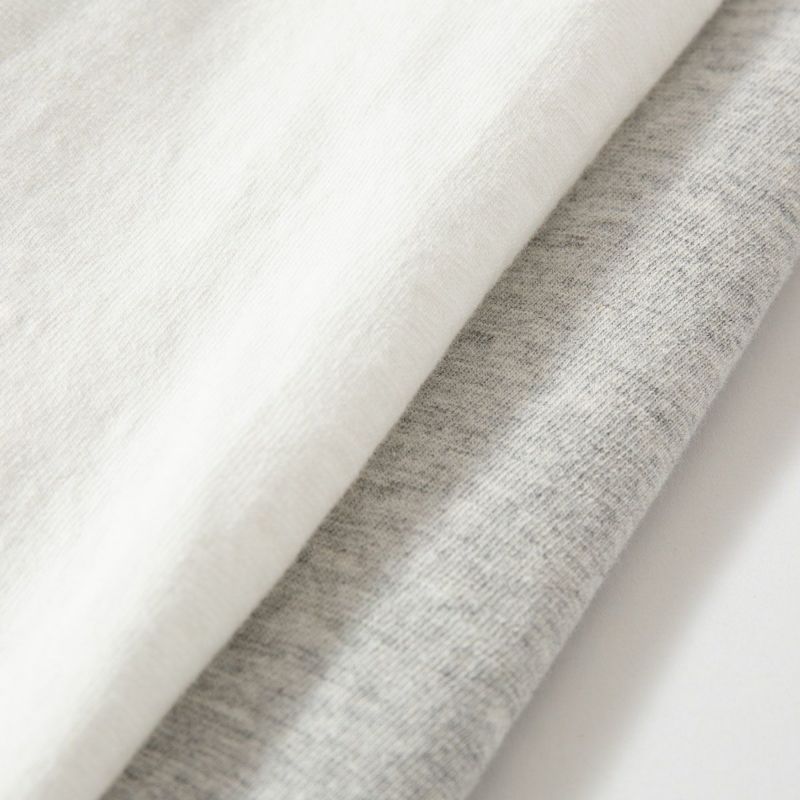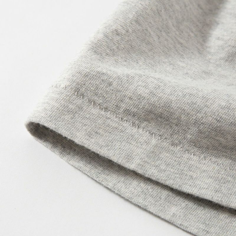 ミドルウェイトで、通常の糸と「スラブ糸」と呼ばれる表面にムラのある糸を交編した、ドライタッチが特長の天竺生地を採用しています。