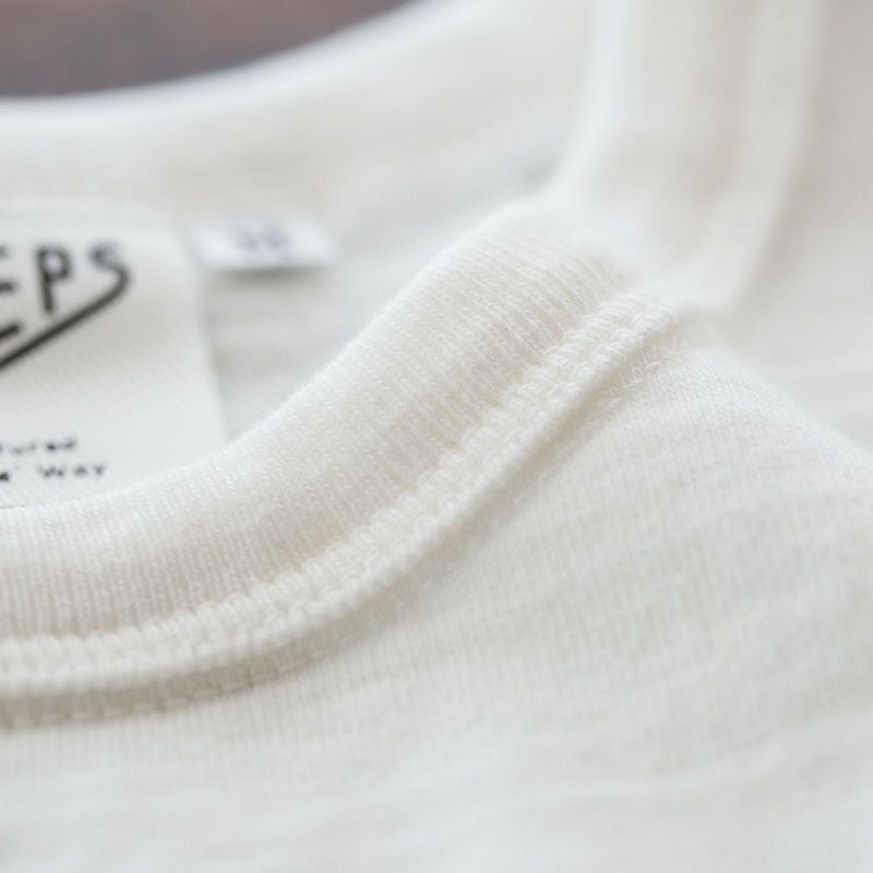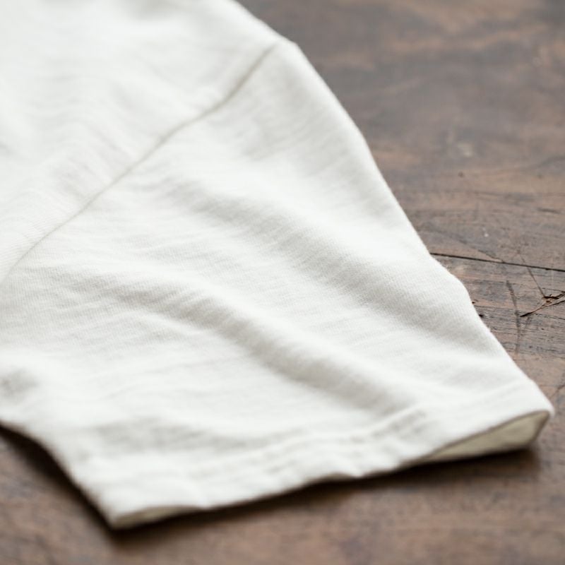 最も大切なネック周りには3本針を使用。Tシャツの本場アメリカで'50年代に行われていた縫製仕様で伸びのないしっかりとしたネックにしました。 3本針の2本をリブに、1本をボディに落とすことで、ネックを補強すると共にボディの伸びを同時に補強しています。