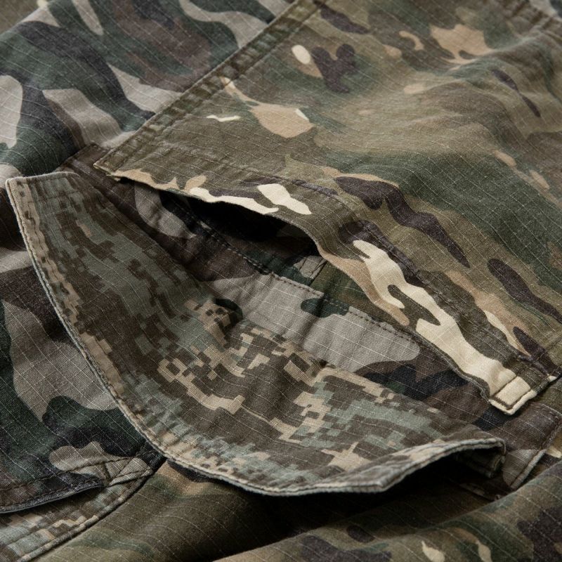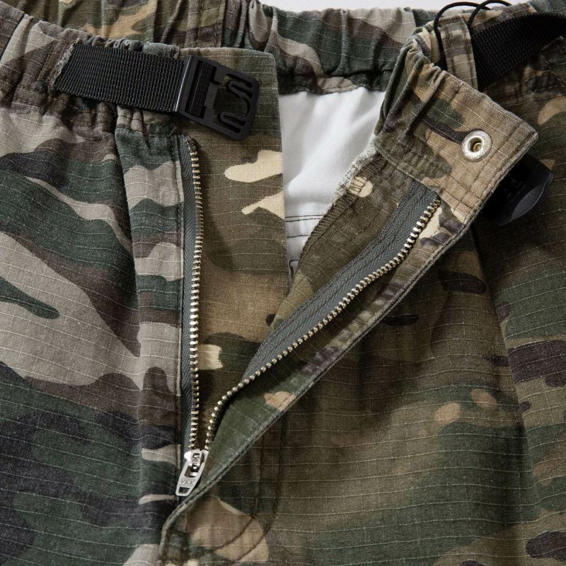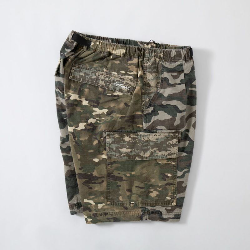 ミリタリーウェアでおなじみカモ柄リップストップ生地で仕立てたカーゴショーツ。米軍に納入実績のあるワイルドシングスならではのリアリティーを感じるアイテムです。