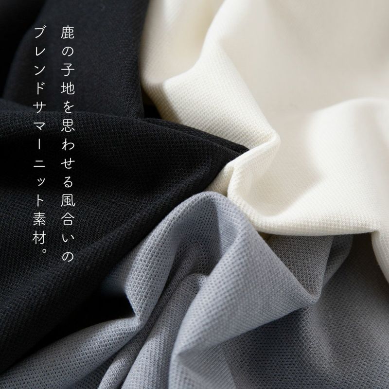 ポリエステル・レーヨン・ポリウレタンをブレンドしたサマーニット使用の五分袖Tシャツ。鹿の子地のような凹凸のある風合いが特徴的で、夏らしいデザインに仕上がっています。