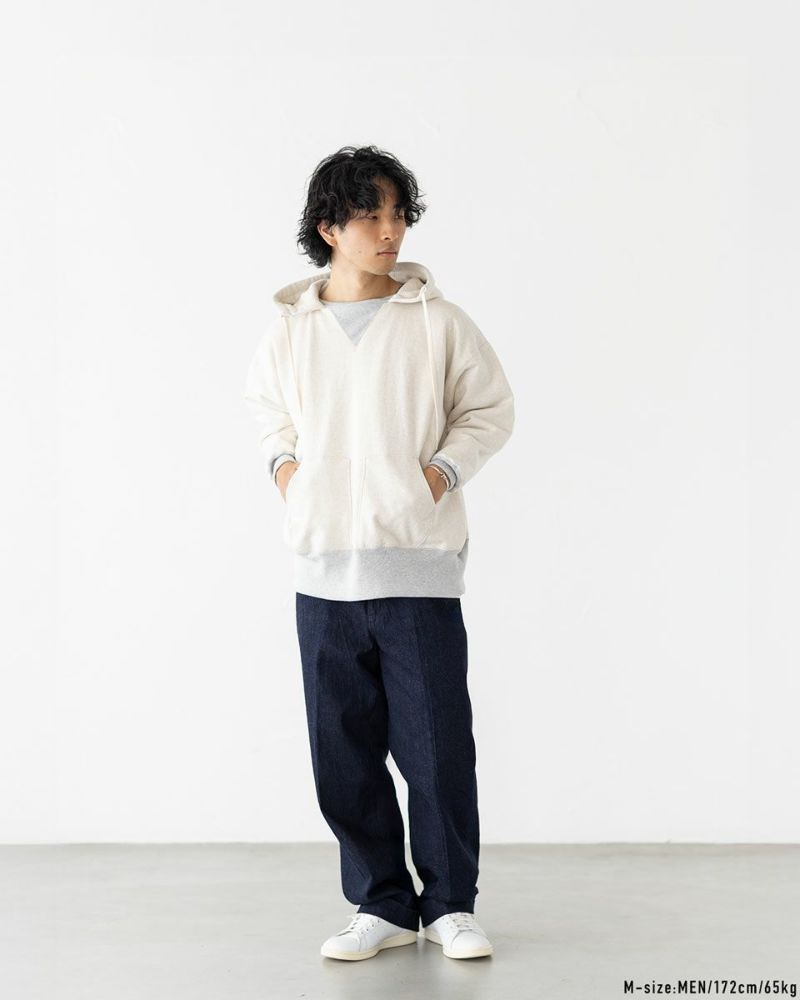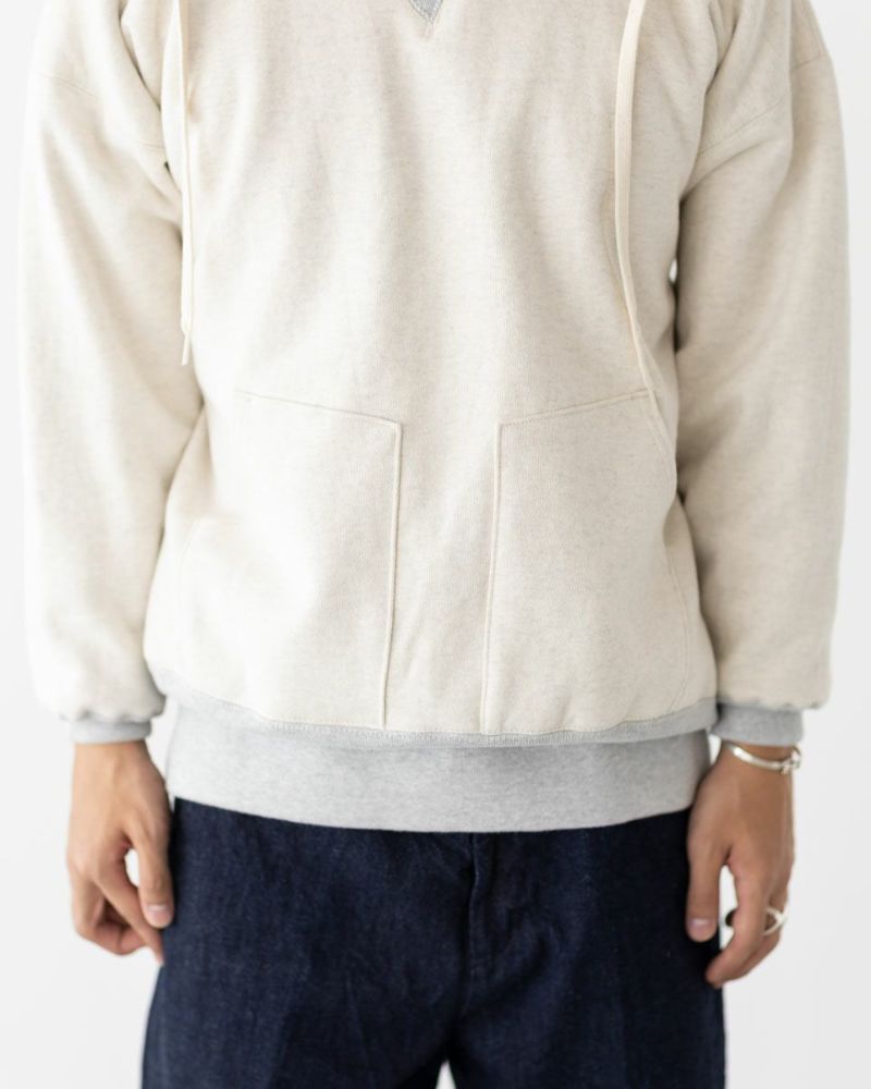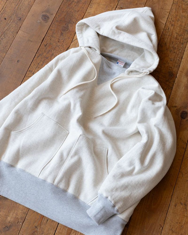 こちらは1950年代頃のビンテージを甦らせた、ダブルフェース生地の裏起毛スウェット後付けパーカー。クルーネックのリブ部分にフードを縫い込んで作られている、当時のアフターフーデッドデザインが特徴です。