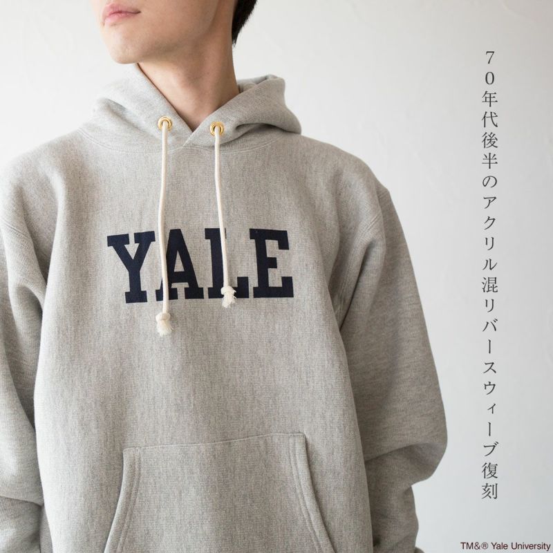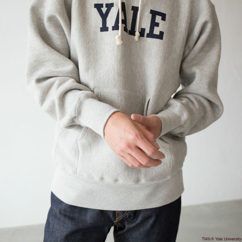 アメリカの消防法によってコットン100%の裏起毛素材が危険とされていた、1960年代後期のアクリル混リバースウィーブ・フーデッドスウェットシャツの復刻モデル。シルバーグレーの表面を杢調の見え方にするためにレーヨンを混ぜ、混率をコットン82%、アクリル12%、レーヨン6%とした点も忠実に再現しています。旧式のシンカー編み機で編み立てた独特のボリューム感とレトロな風合いも魅力。プリントデザインはオフィシャルカレッジライセンスを使用したイェール大学のネームを染込みプリントで表現。日本製の高品質なモノづくりによってチャンピオンのコアファンも納得の仕上がりとなっています。
