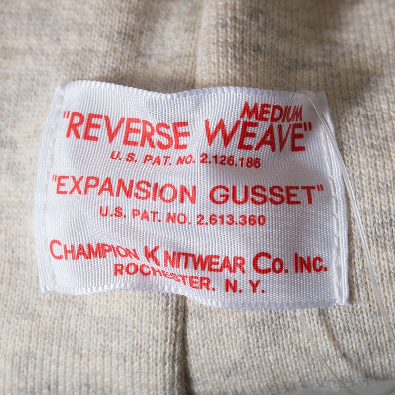 四方をすべて縫い込んだ通称「タタキタグ」も当時のディテールのまま。「REVERSE WEAVE」と「EXPANSION GUSSET」のパテントナンバーを表記した襟ネームも忠実に再現しています。左袖にCロゴワッペンが付いていない点も当時の仕様そのままです。