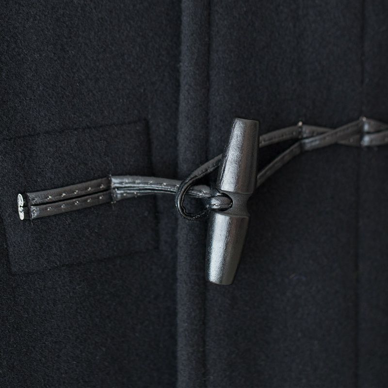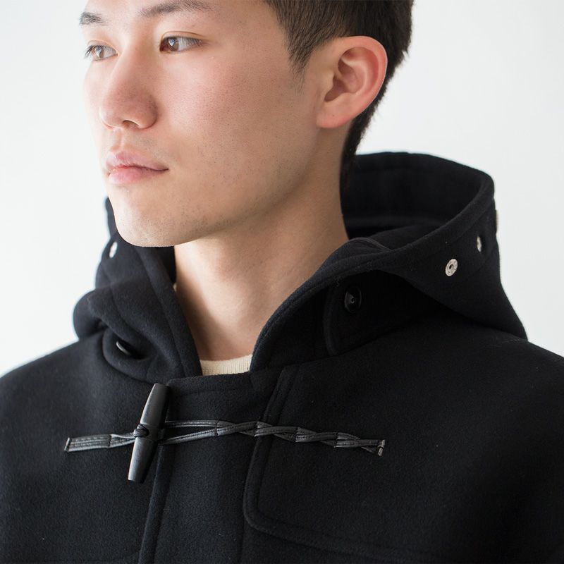 柔らかな風合いのウールメルトン生地はしっかり防寒できて快適に着続けることが可能。木製トグルや本革ループはシックなブラックで統一、フードの調整ボタンやチンストラップなど本格ディテールもしっかり備えたつくりです。