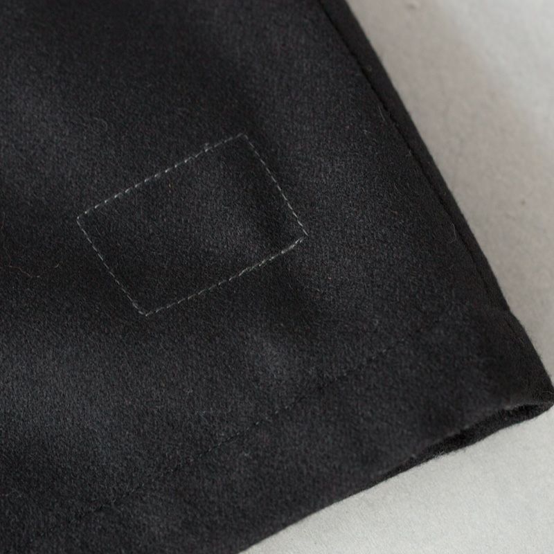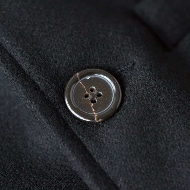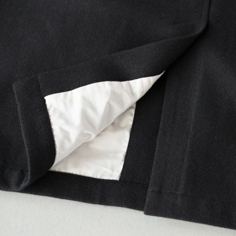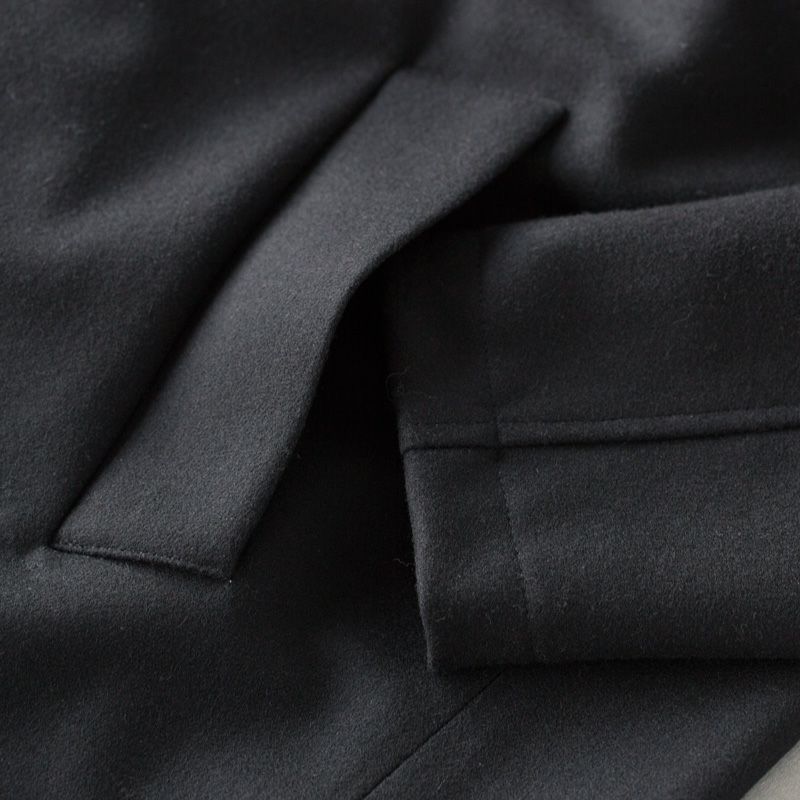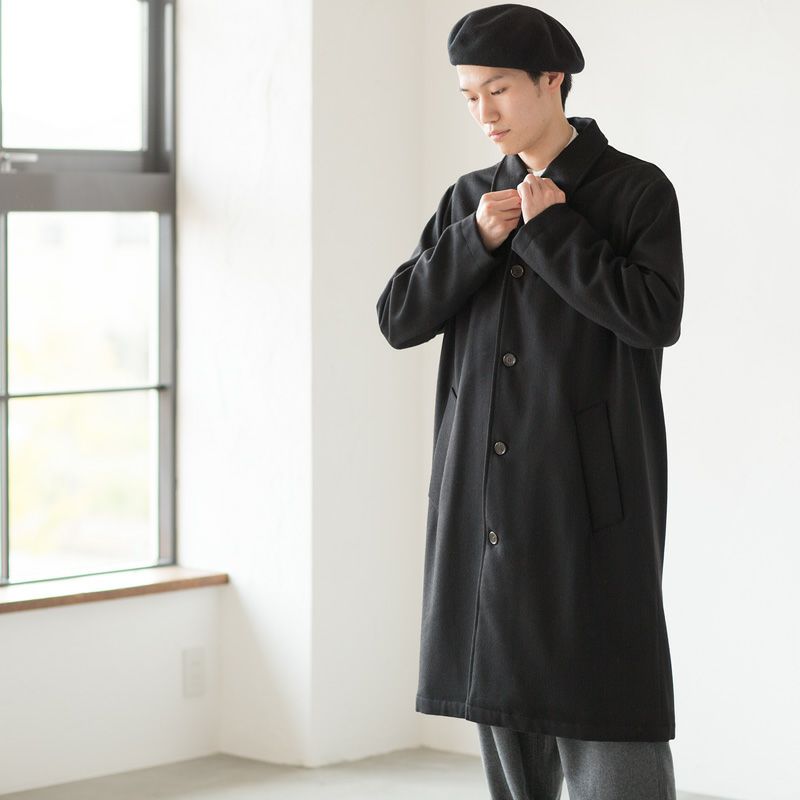 こちらは上品でしなやかな風合いのメルトンウールで仕立てた、オーバーサイズ・ステンカラーコート。