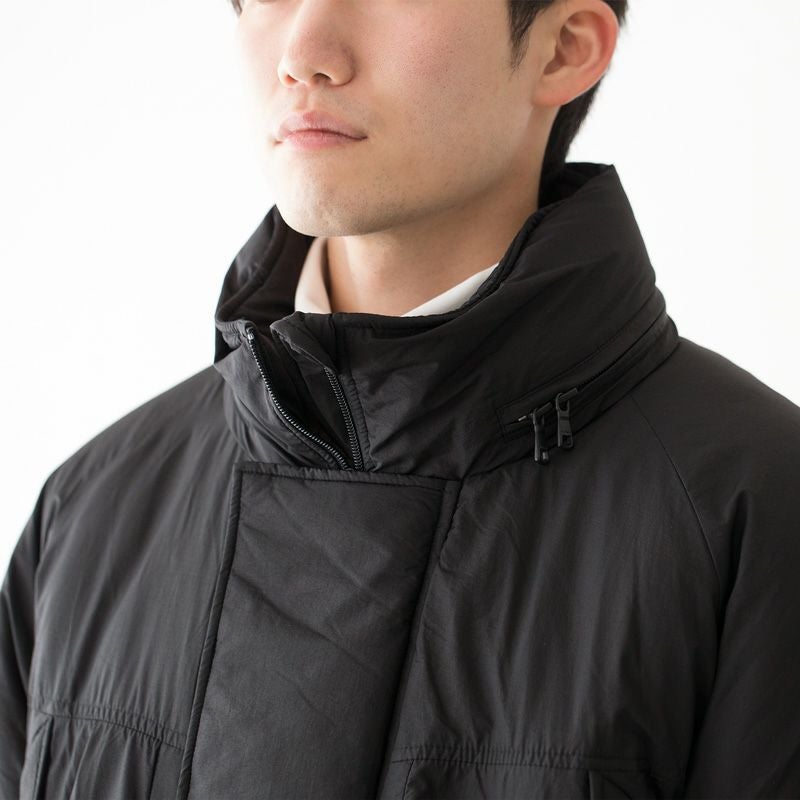 ・スタンドカラー内部に収納可能な中綿入りフード。