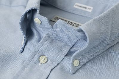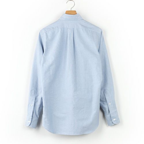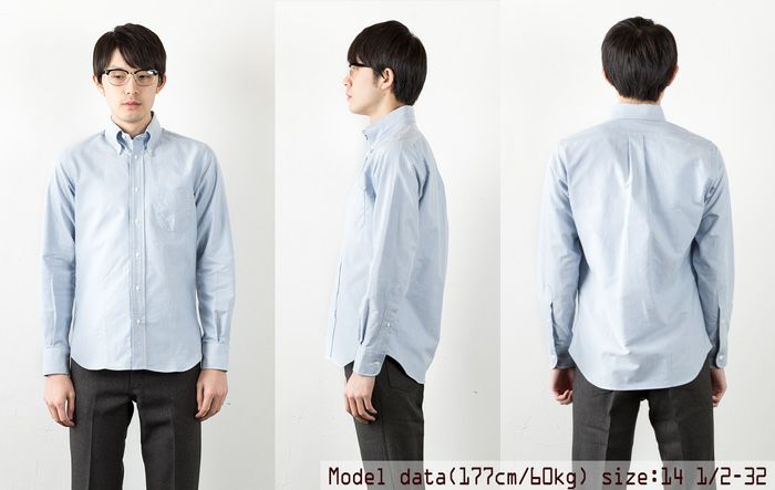 綺麗な形のボタンダウンカラー。首裏に織りネームタグ。丸型の胸ポケット。光沢と厚みを持たせたボタン。ラウンド型のカフス。細巻縫いのサイドシーム。