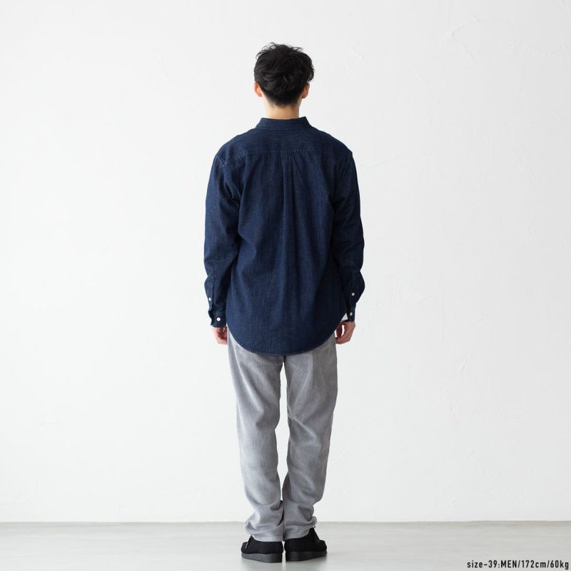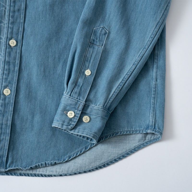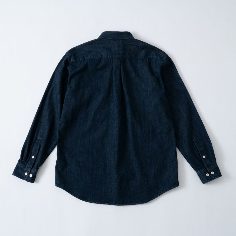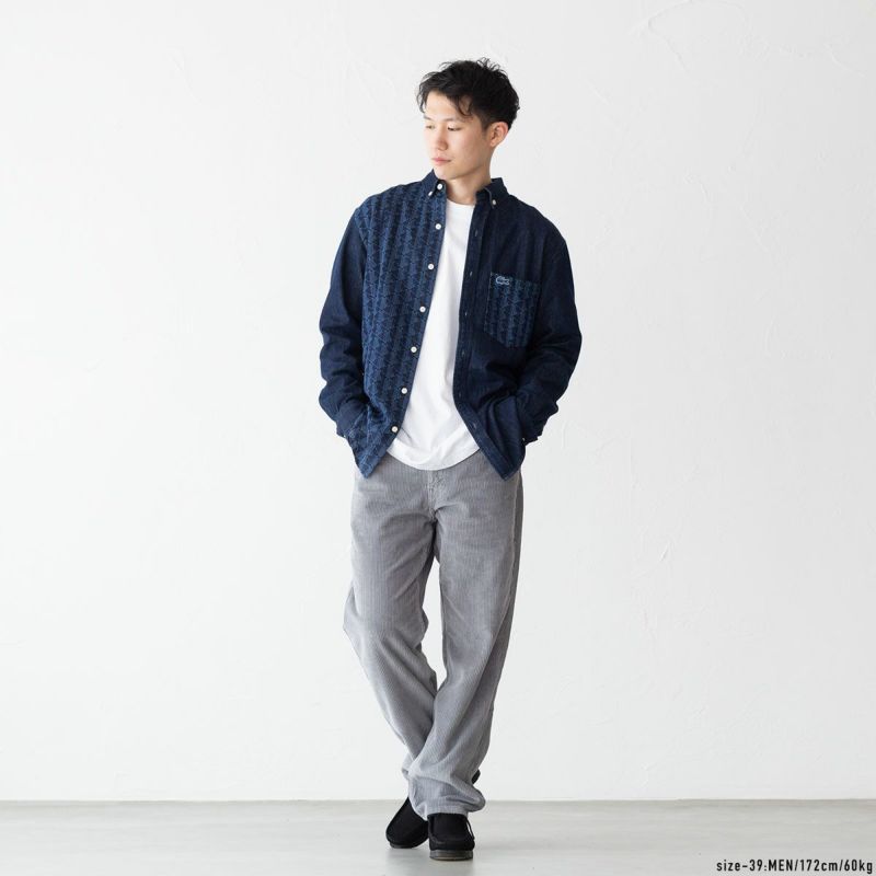 片側だけにモノグラム柄をフィーチャーしたアシンメトリーなデニムシャツ。伸縮性を備えたストレッチデニム採用しています。ラフな雰囲気で着こなせるリラックスフィット。太めのミリタリーパンツやチノパンと相性抜群です。