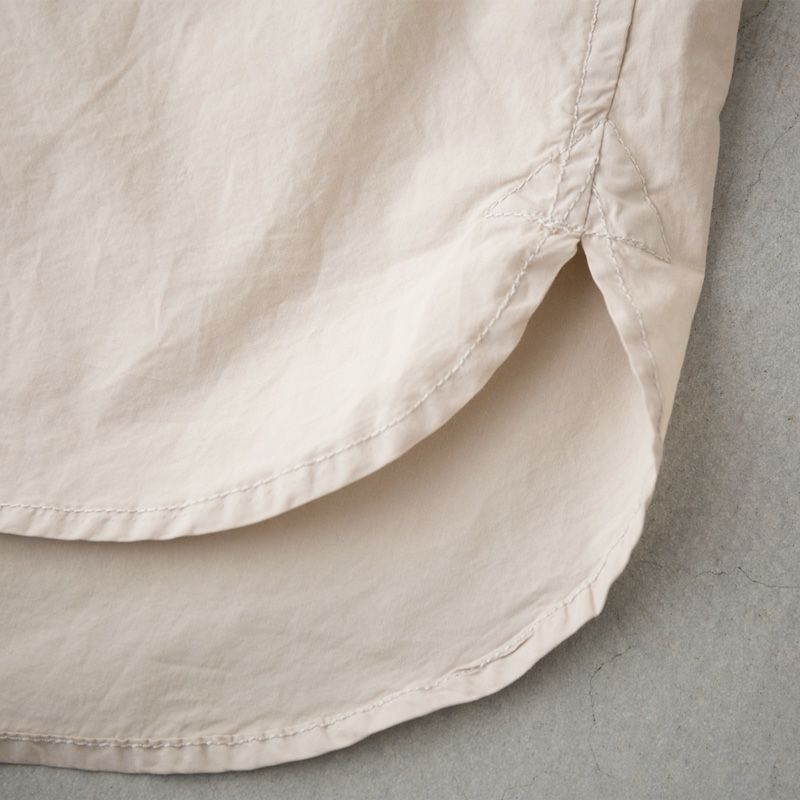 ハリのあるタイプライタ生地を使い、洗い晒したような風合いに仕上げたワークテイストのレギュラーカラーシャツ。余計な装飾をそぎ落としたミニマルデザイン、ゆったりとしたボックスシルエットでトレンドの着こなしも難なくこなせる優秀シャツです。