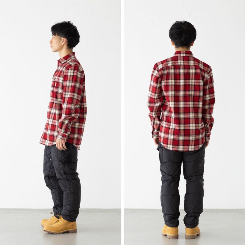 カーハート定番のワークパンツとの相性はもちろん、デニムやチノなどアメカジ感のあるアイテムともよく馴染みます。堅牢さとチェック柄を生かして腰に巻いたり、スウェットやジャケットとのレイヤードなど、その使い方は多岐にわたります。