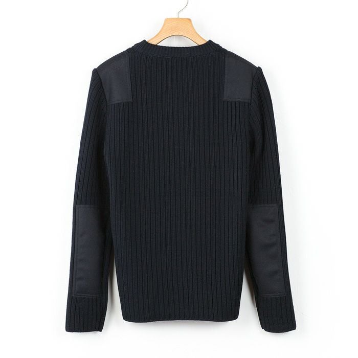 本格的な厚みと硬さを再現した、アクリル混ウールのリブ編みニット。耐久性を高めるメルトン素材のショルダーパッチとエルボーパッチが、無骨なアクセントになっています。