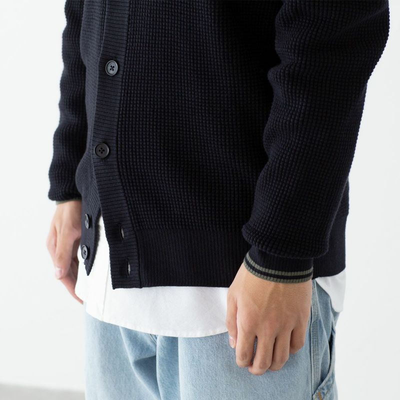ミニマルな印象に仕立てた、フレッドペリーのワッフルニットカーディガン