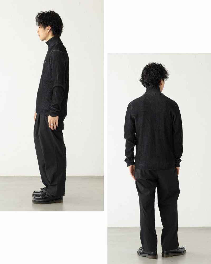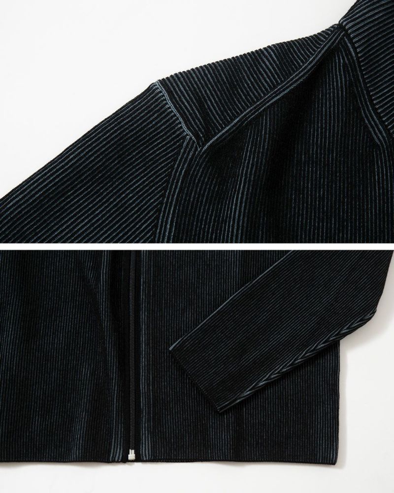適度なゆとりと動きやすさがありながらラフに感じさせない、やや細めの形。袖と裾は切り替えでなく縫い目なしの一枚の生地で構成することでも、シルエットに曲線が生まれずスマートな印象に仕上がっています。