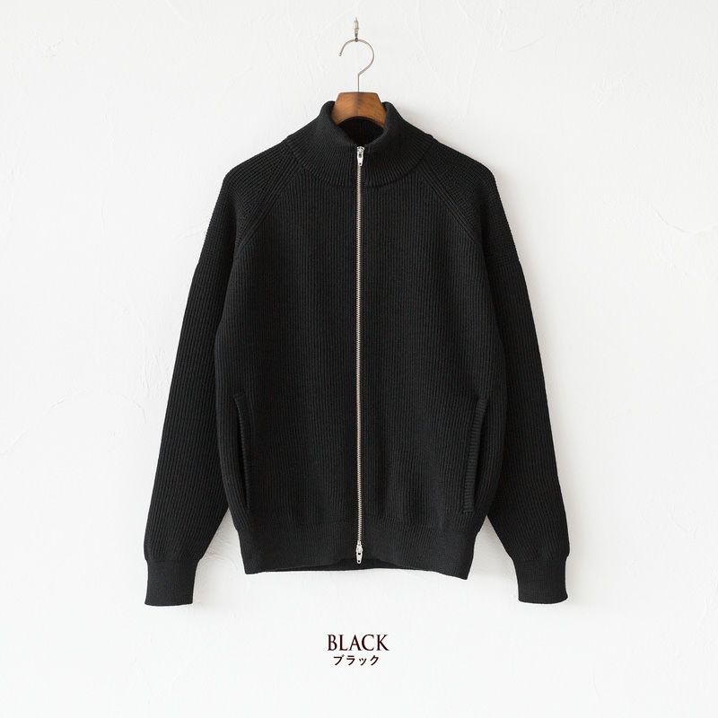 こちらは網目の詰まった8ゲージの畦編みが暖かい、上品な印象のジップアップジャケットです。