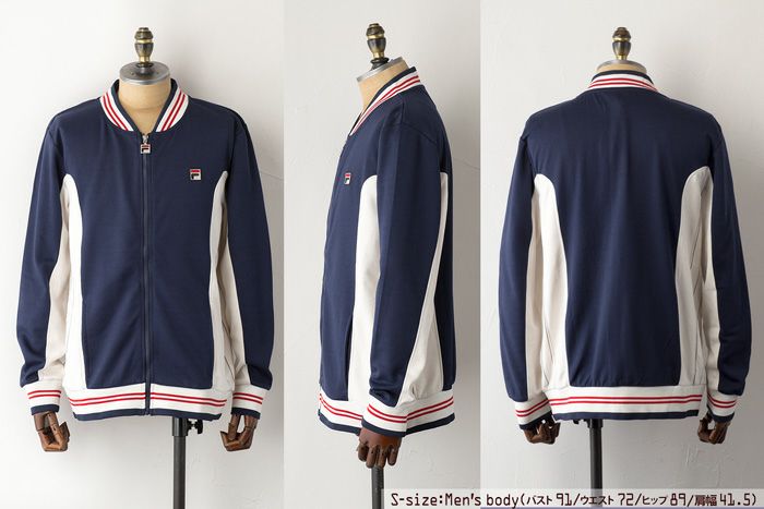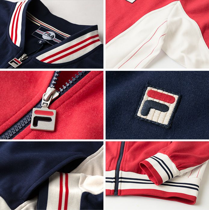 クラシカルなボンバータイプのリブネック。ネック・袖口、裾リブに2本ライン入り。 身頃脇のアイボリーのストライププリントで切替え。オリジナルにはないサイドポケットを追加。 左胸にFILAの象徴、Fボックスロゴの刺繍入り。