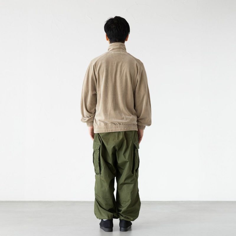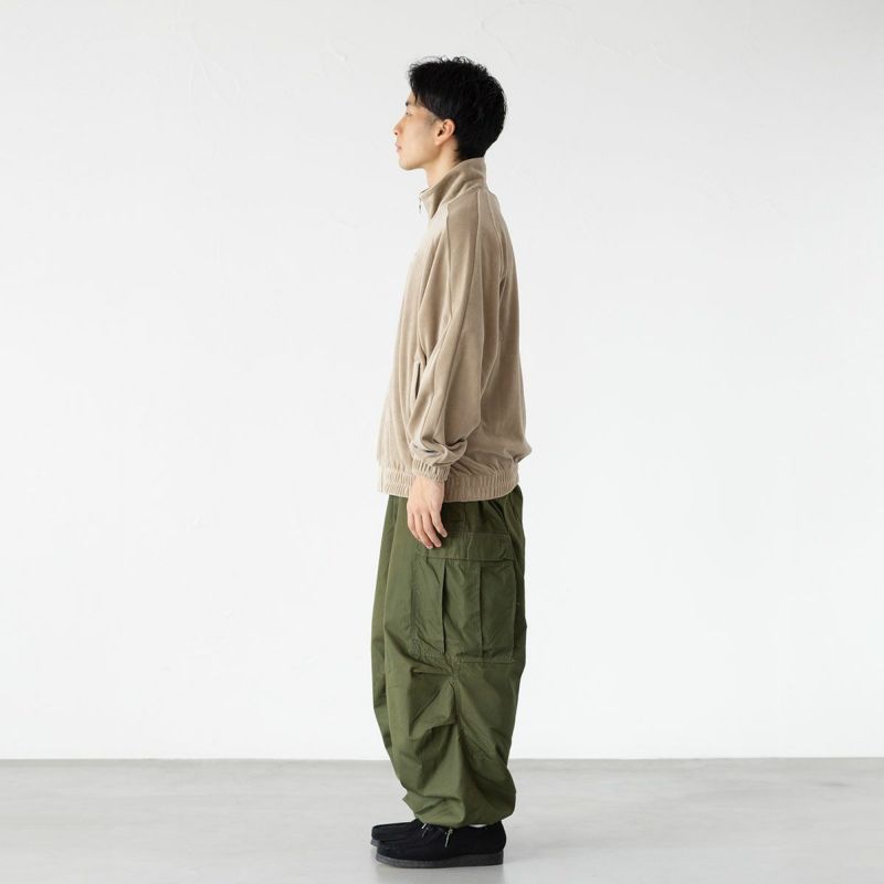 お揃いのトラックパンツはもちろん、カーゴパンツや色落ちしたデニムなどで古着っぽく着こなすのがおすすめ。