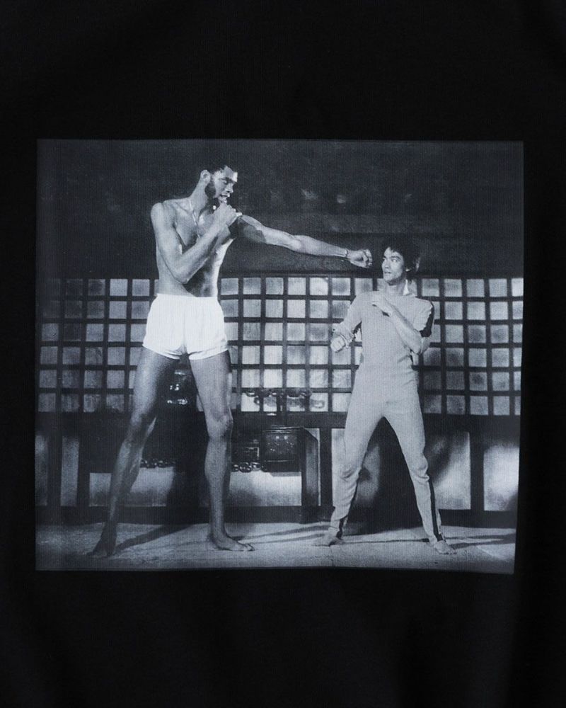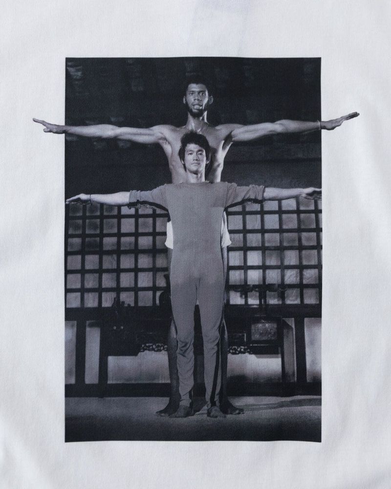 70年代の名作カンフー映画「死亡遊戯」で共演した、若き日のブルース・リーとカリーム・アブドゥル・ジャバーをフィーチャーした半袖Tシャツ。