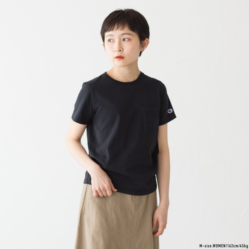 チャンピオンの定番ポケットTシャツ。女性らしいキレイなシルエットです。