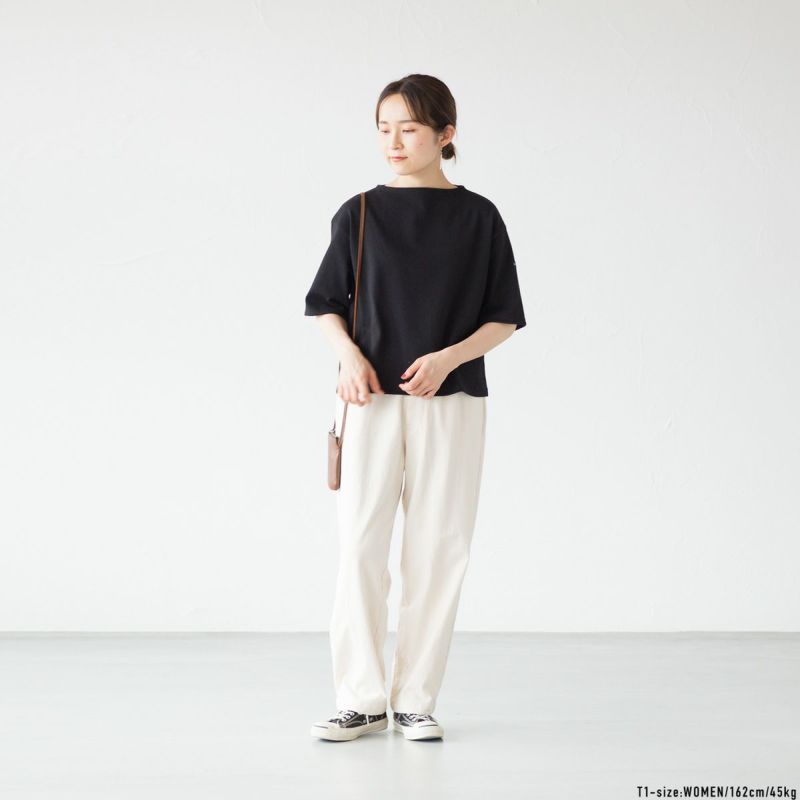 おなじみのボートネックはそのままに、ボディラインを拾いにくい素材感と肘が隠れる袖丈でスッキリとしたスタイルが完成します。