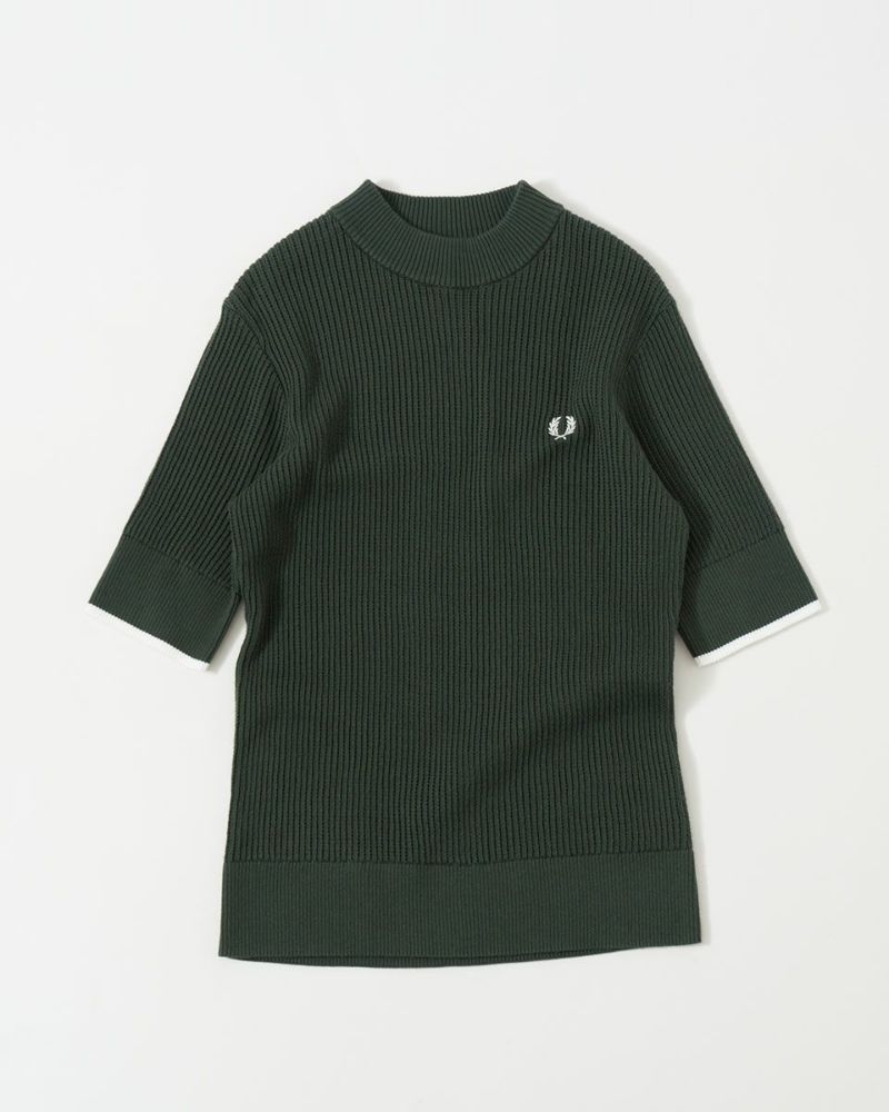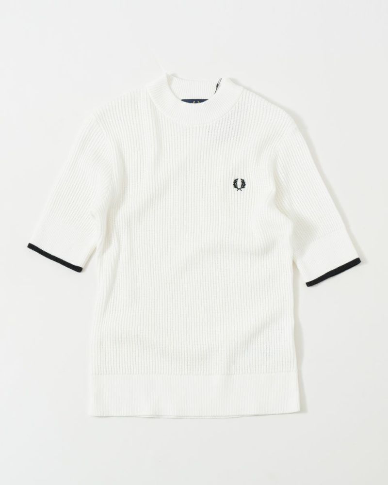 アーカイブのテニスニットからインスパイアされた編地で、ややモックネックで長めの半袖、コントラストの効いたカフのティップラインが特徴です。