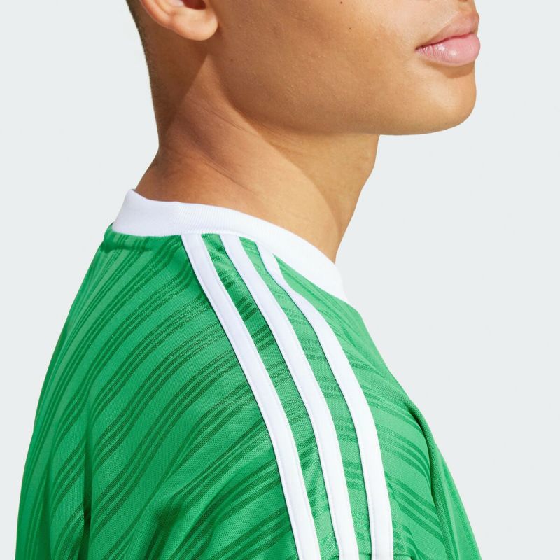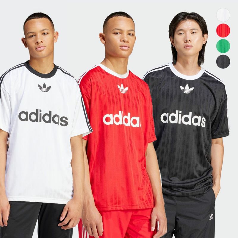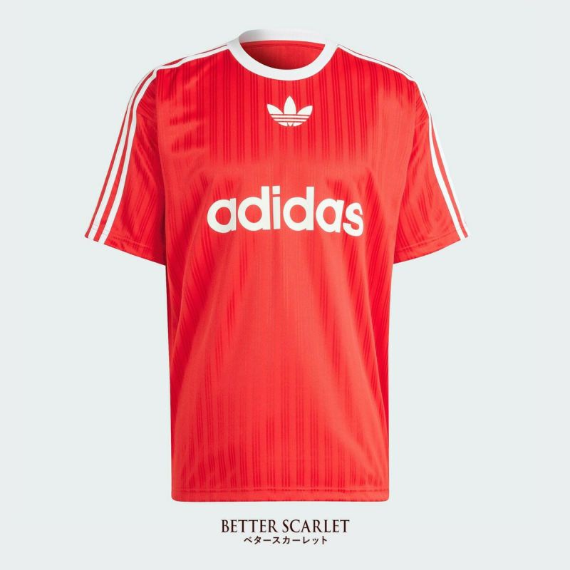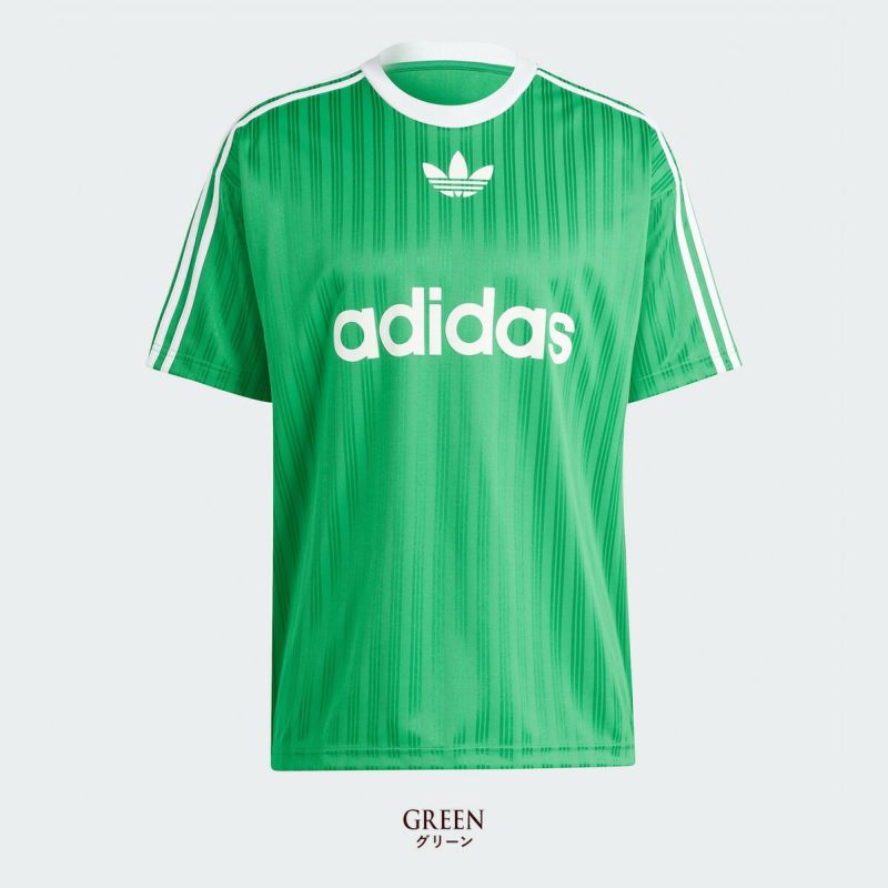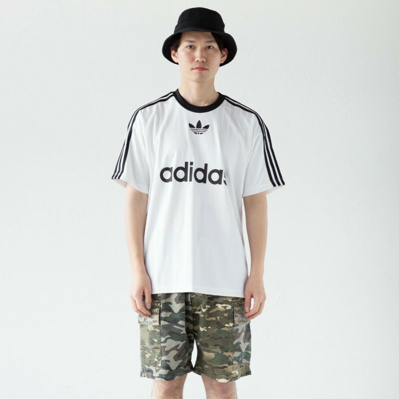 フロントのセンターにトレフォイルとブランドネームのプリント、肩から袖にかけてはお馴染みのスリーストライプがしっかり主張。光の反射で浮かび上がるボディのストライプもクールです。
