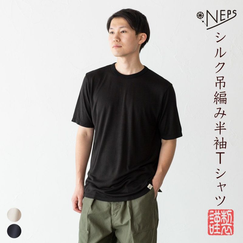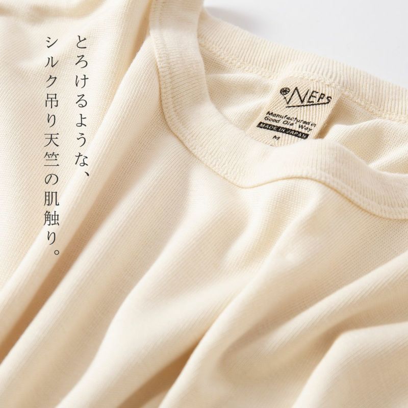 吊り編みによるふんわり柔らかな着心地で多くのお客様から支持されているNEPSのTシャツ。こちらはシルク100%を旧式吊り編み機で編み立てた丸胴天竺の半袖モデルです。