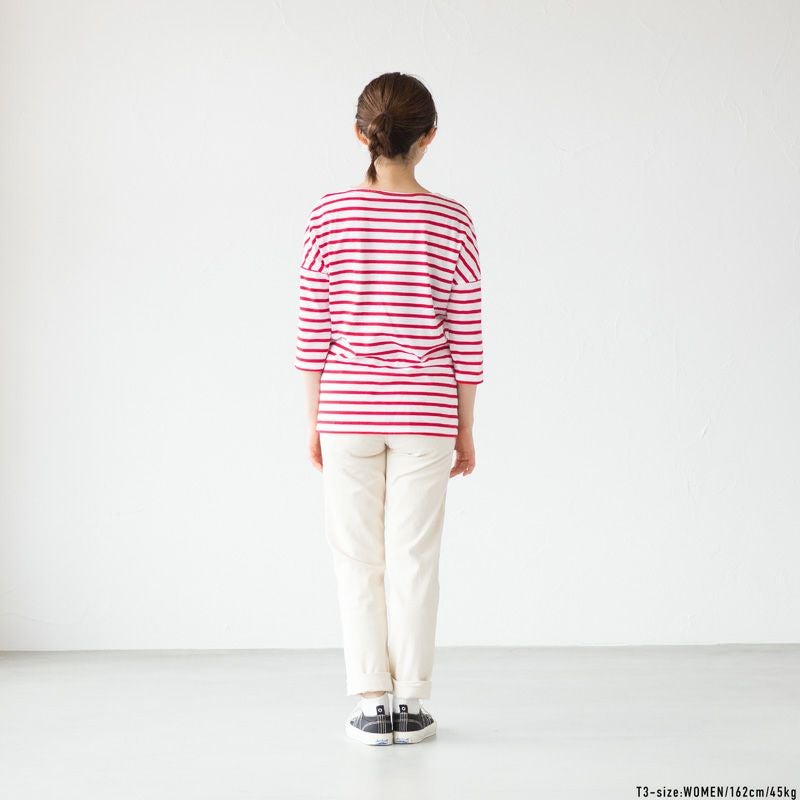 ドロップショルダーで女性らしさアップ、肩から袖にかけて新鮮なボーダー切り替えを楽しめるのもポイント。