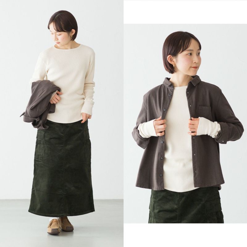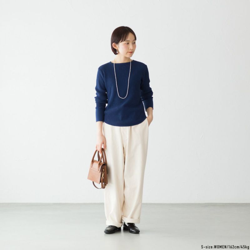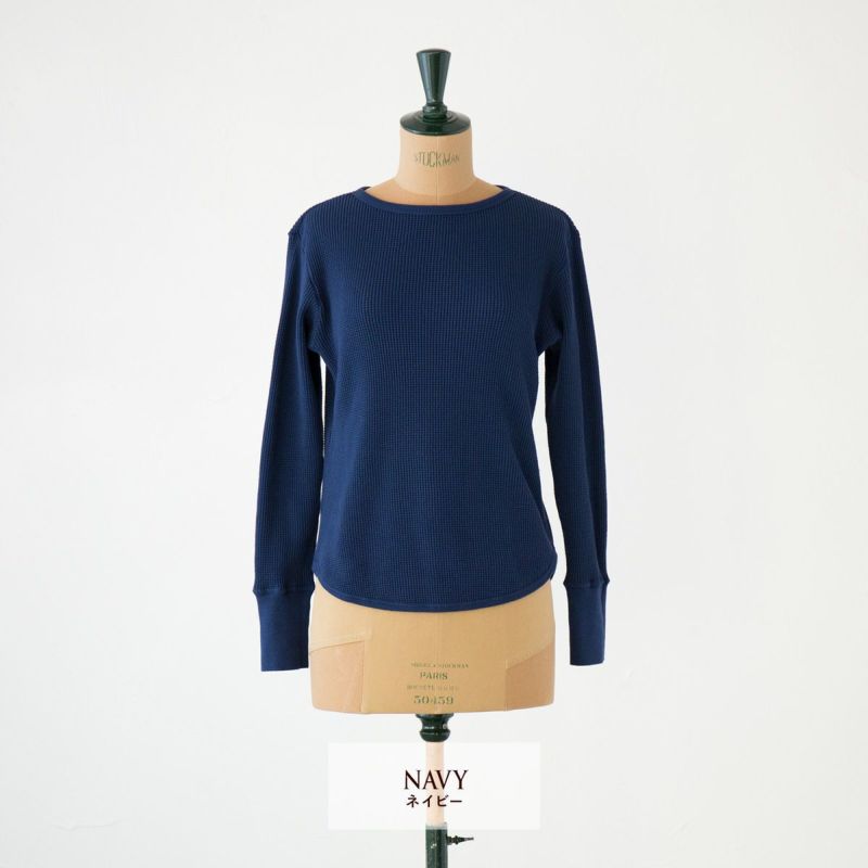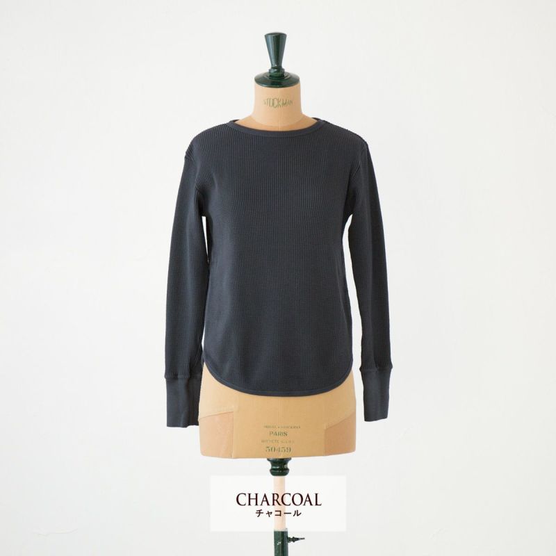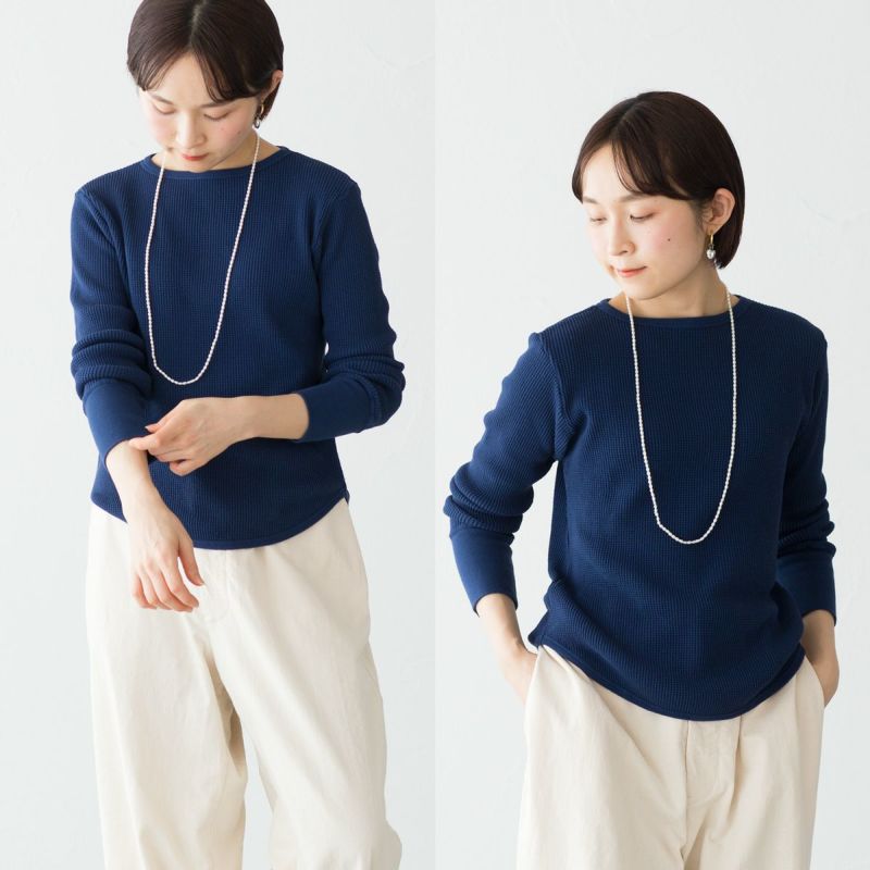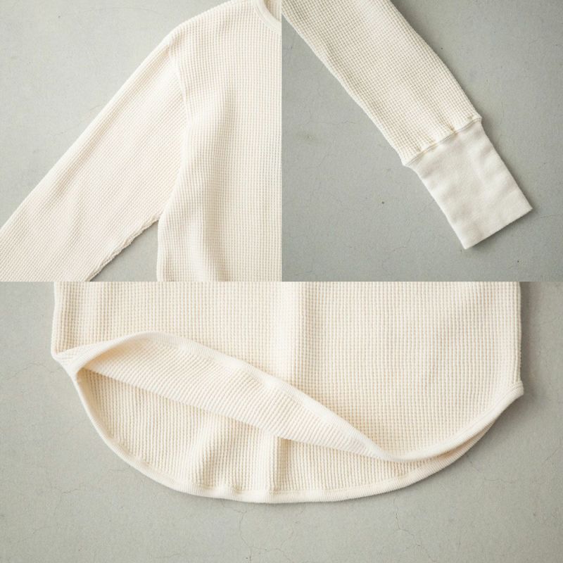 適度な厚みがあり、着伸びしにくいワッフル。一枚着で気になる透け感もなく、レディースアイテムながらどこか無骨なかっこよさも兼ね備えた生地です。
