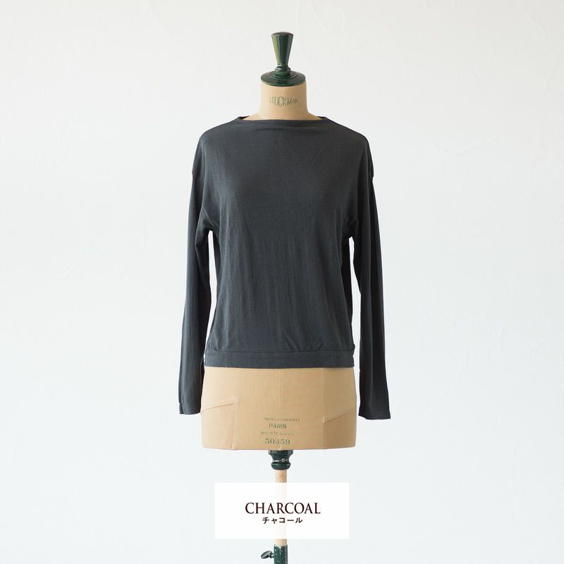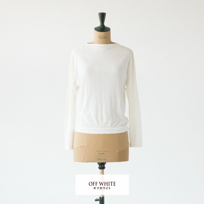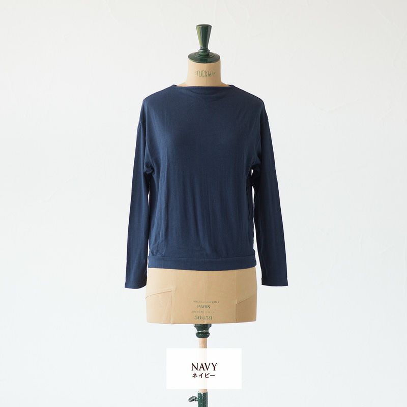 柔らかな生地感を生かしたデザインは、やや立ち上がり気味のボートネックが特長。