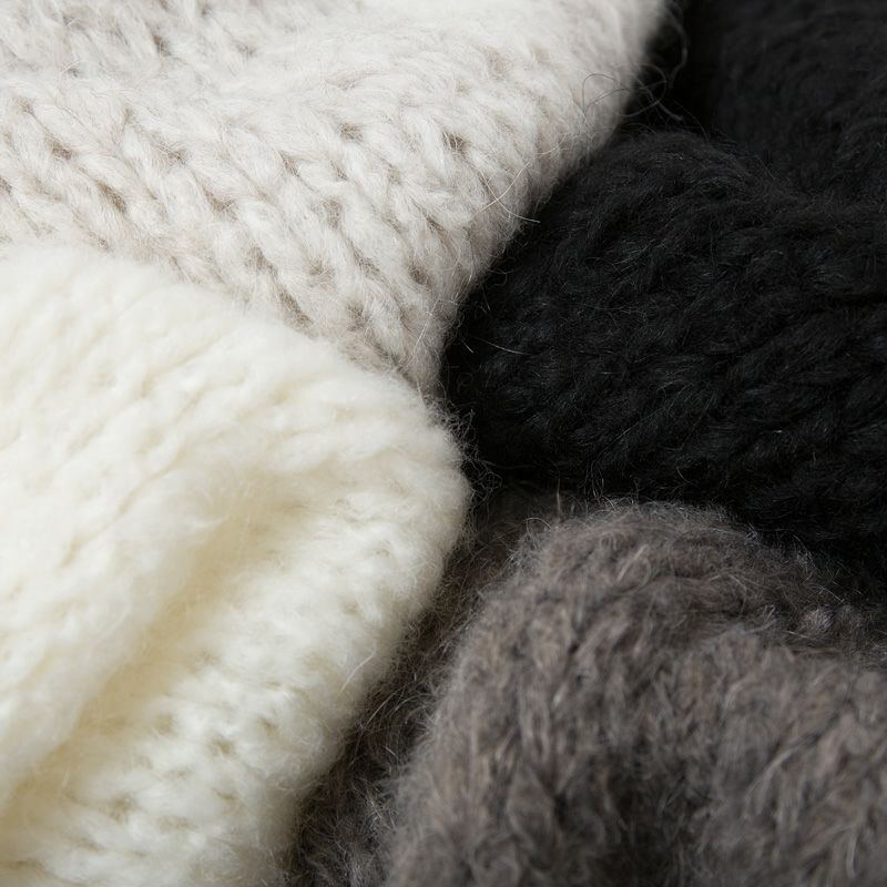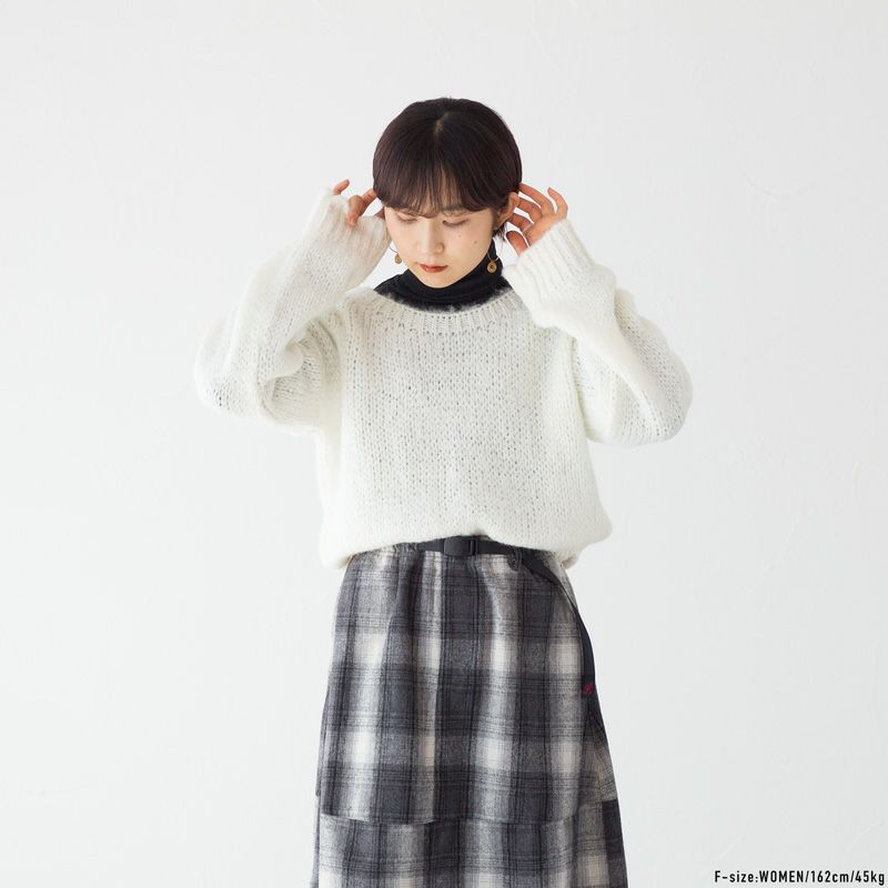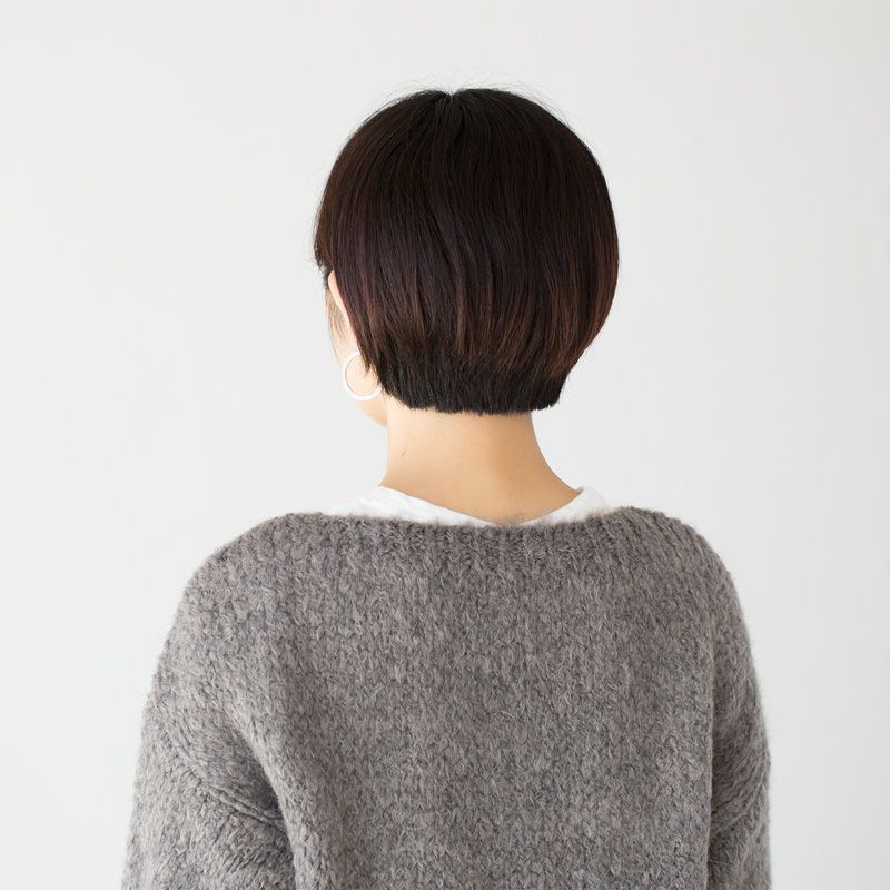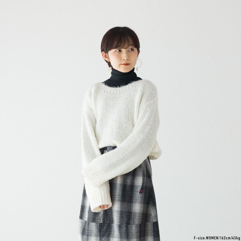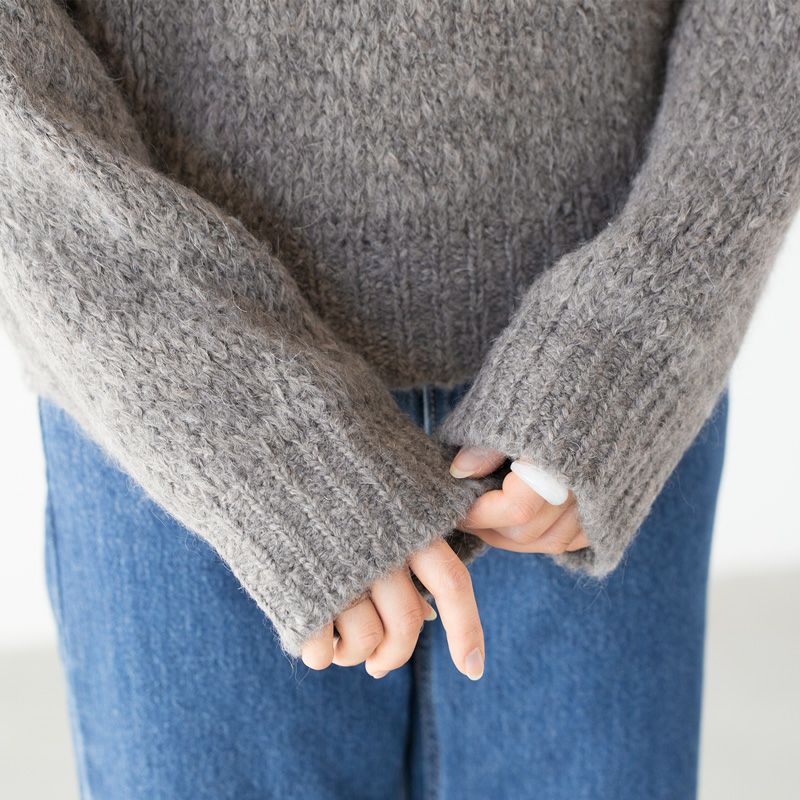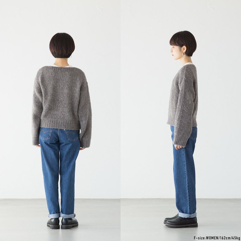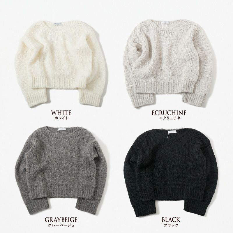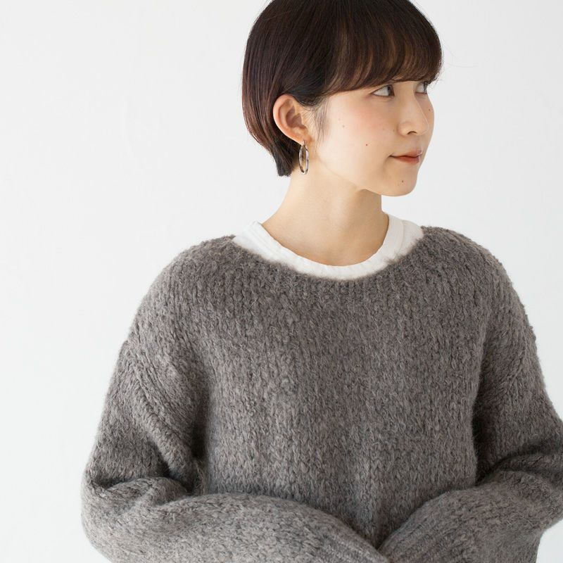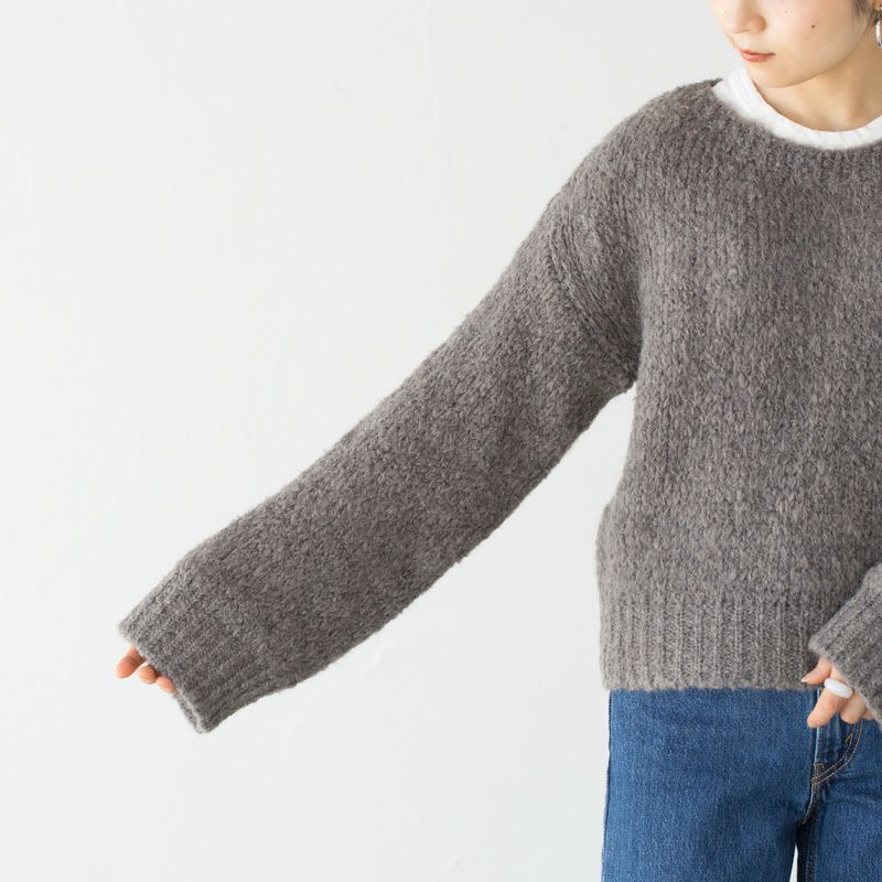 毛足の長いモヘヤ混。ふわふわでチクチクしにくい素材感で一枚でもさらっと着やすい◎。