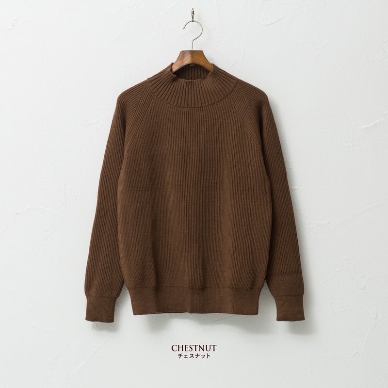 こなれ感を演出できるラグランスリーブ、太めのリブ編みで切り替えたハイネックがポイント。