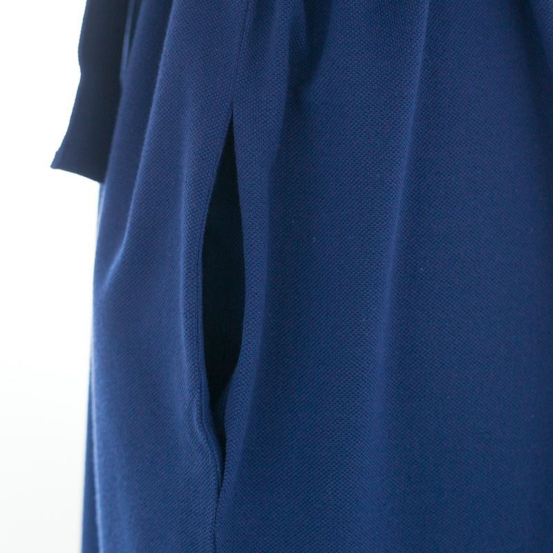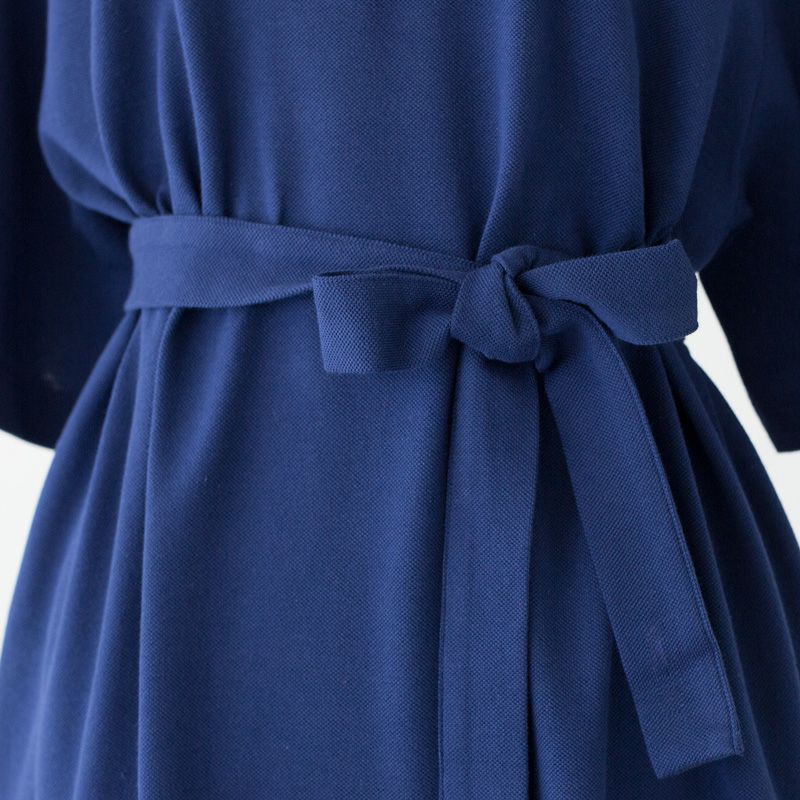 肌触りの良いオーガニックコットンを使用した鹿の子素材のロングワンピース。コバルトブルーの鮮やかなボディに3つボタンのドローストリングス付きフードと着脱可能なカットベルトを装着。カフタンドレスをモチーフにしたシルエットで、春夏シーズンに映える爽やかなモダンフェミニンスタイルを演出します。