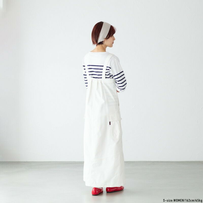 しっかりコットンツイル生地の、グラミチ「カーゴドレス」。こちらはミリタリーウェアにも使われる、耐久性の高い“コットンドリルファブリック”を使ったジャンパースカートです。